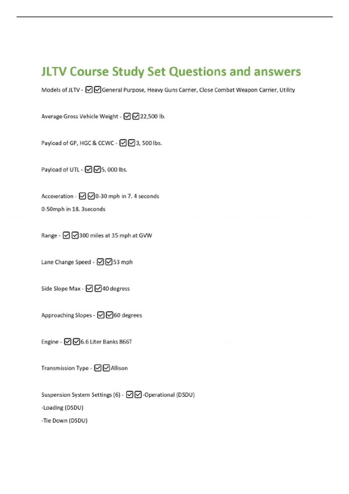 JLTV Course Study Set Questions and answers Models of JLTV - General Purpose, Heavy Guns Carrier, Close Combat Weapon Carrier, Utility Average Gross Vehicle Weight - 22,500 lb. Payload of GP, HGC & CCWC - 3, 500 lbs. Payload of UTL - 5, 000 lbs. Acceıeration - 0-30 mph in 7. 4 seconds 0-50mph in 18. 3seconds Range - 300 miles at 35 mph at GVW Lane Change Speed - 53 mph Side Slope Max - 40 degress