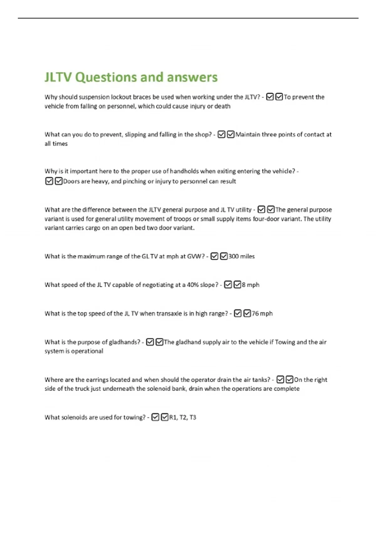 JLTV Questions and answers Why should suspension lockout braces be used when working under the JLTV? - To prevent the vehicle from falling on personnel, which could cause injury or death What can you do to prevent, slipping and falling in the shop? - Maintain three points of contact at all times Why is it important here to the proper use of handholds when exiting entering the vehicle? - Doors are heavy, and pinching or injury to personnel can result What are the difference between the JLTV general purpose and JL TV utility - The general purpose variant is used for general utility movement of troops or small supply items four-door variant. The utility variant carries cargo on an open bed two door variant. What is the maximum range of the GL TV at mph at GVW? - 300 miles