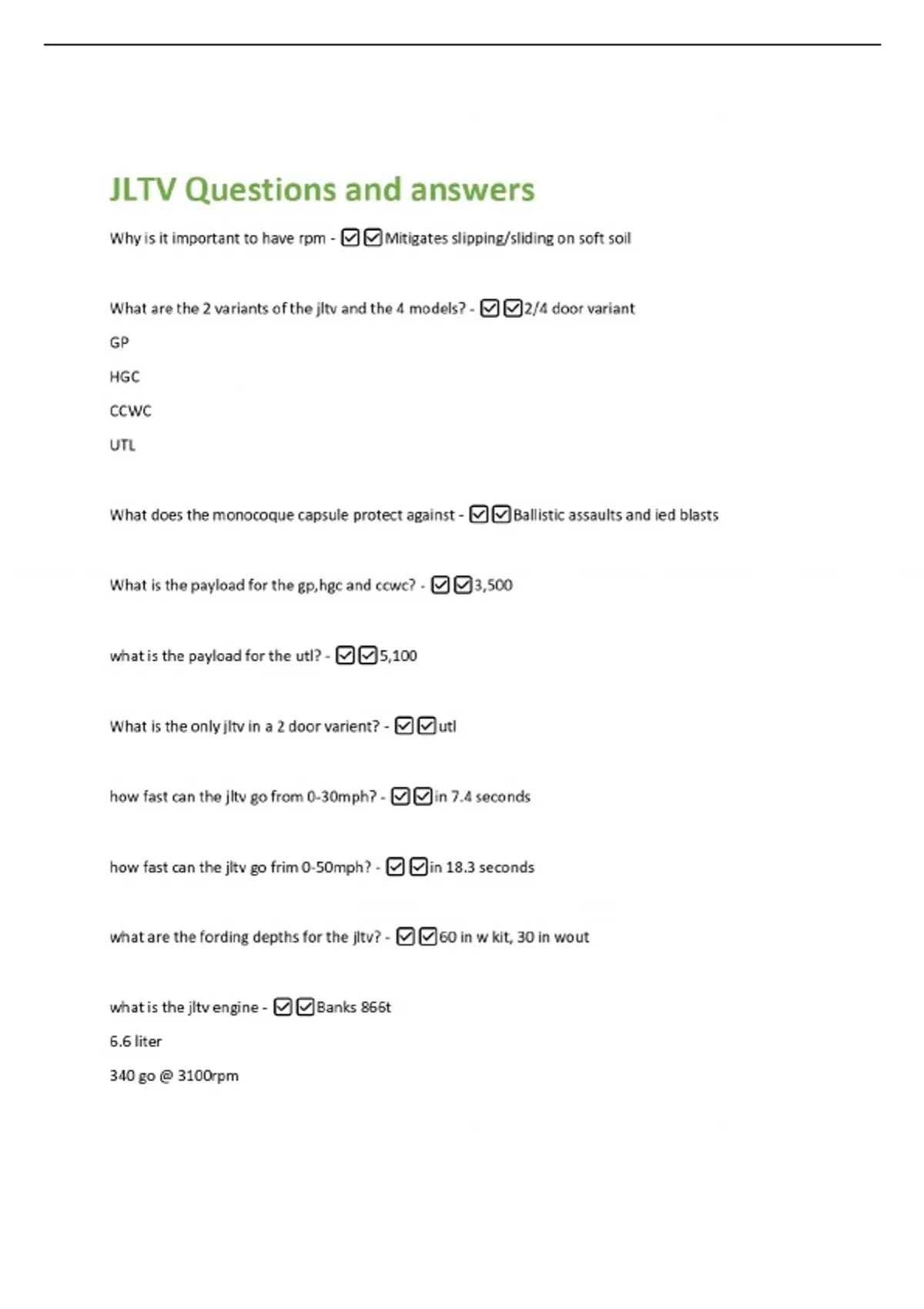 JLTV Questions and answers Why is it important to have rpm - Mitigates slipping/sliding on soft soil What are the 2 variants of the jltv and the 4 models? - 2/4 door variant GP HGC CCWC UTL What does the monocoque capsule protect against - Ballistic assaults and ied blasts What is the payload for the gp,hgc and ccwc? - 3,500 what is the payload for the utl? - 5,100