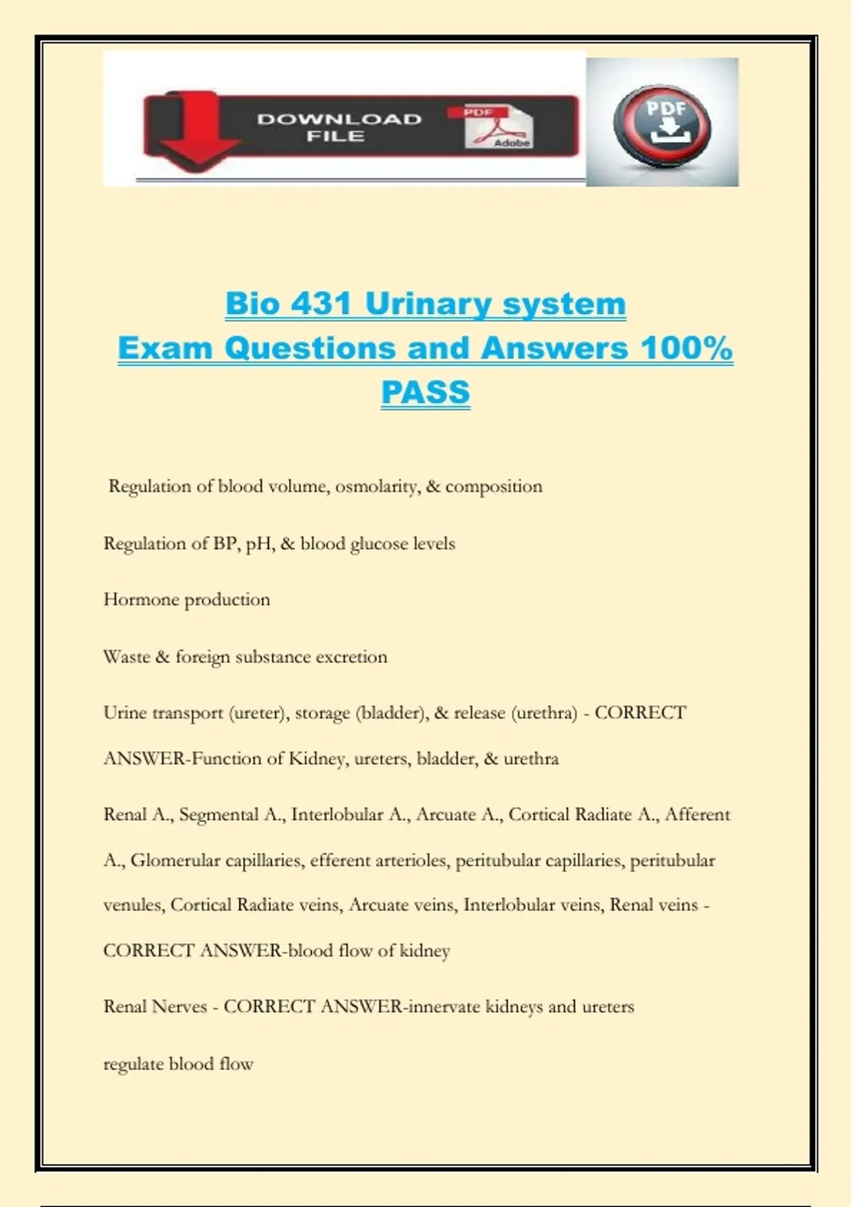 Bio 431 Urinary system Exam Questions and Answers 100% PASS