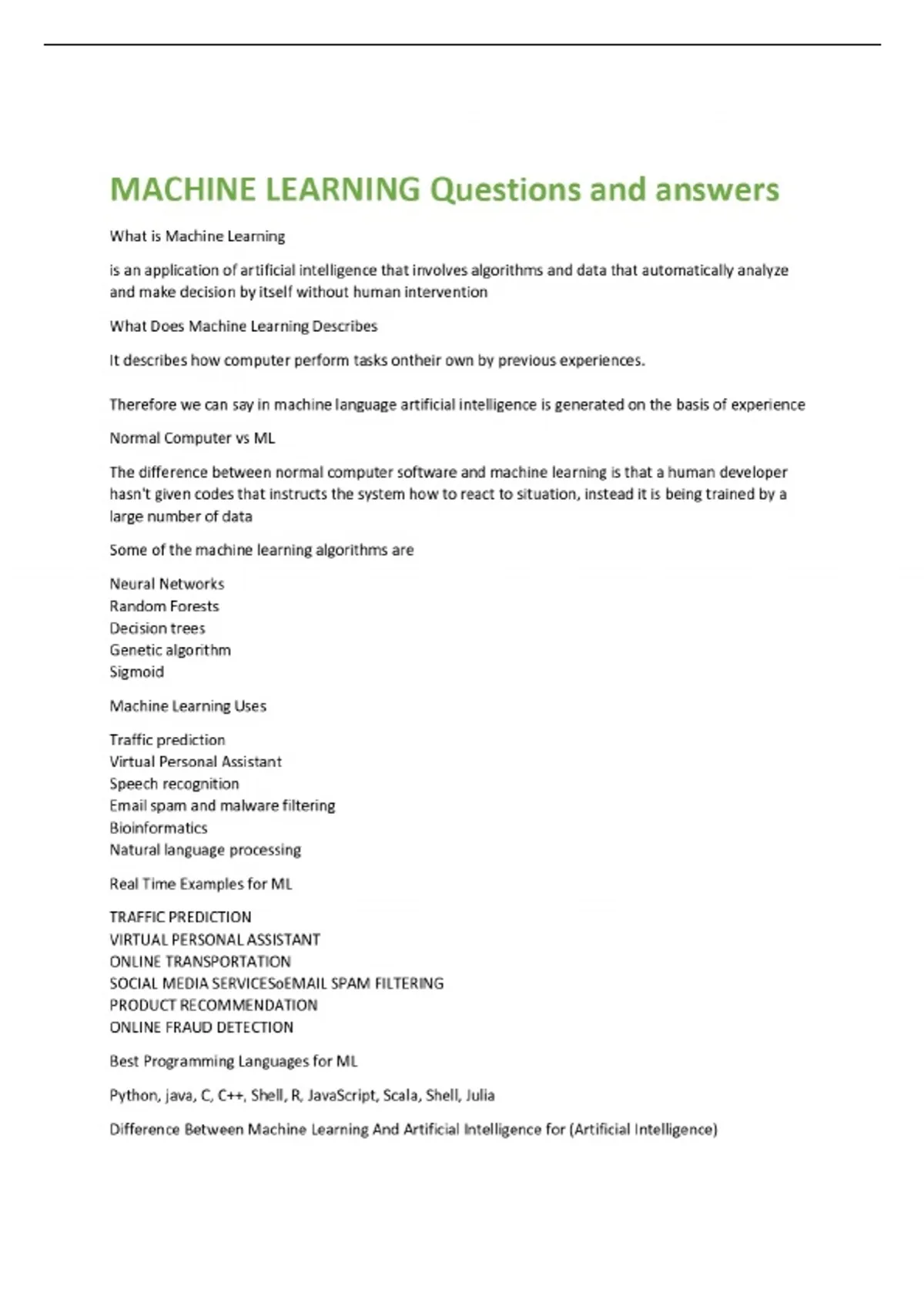 MACHINE LEARNING Questions and answers What is Machine Learning is an application of artificial intelligence that involves algorithms and data that automatically analyze and make decision by itself without human intervention What Does Machine Learning Describes It describes how computer perform tasks ontheir own by previous experiences. Therefore we can say in machine language artificial intelligence is generated on the basis of experience Normal Computer vs ML The difference between normal computer software and machine learning is that a human developer hasn't given codes that instructs the system how to react to situation, instead it is being trained by a large number of data Some of the machine learning algorithms are
