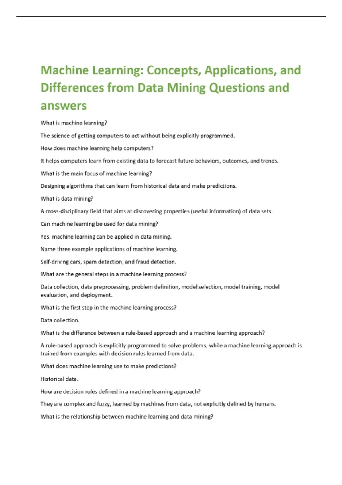 Machine Learning: Concepts, Applications, and Differences from Data Mining Questions and answers