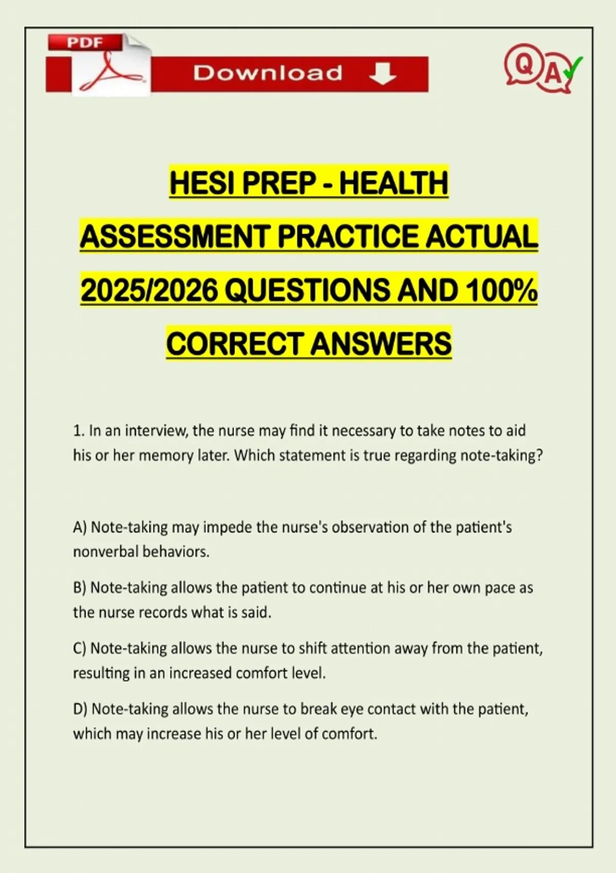 HESI PREP - HEALTH ASSESSMENT PRACTICE ACTUAL 2025/2026 QUESTIONS AND 100% CORRECT ANSWERS 1. In an interview, the nurse may find it necessary to take notes to aid his or her memory later. Which statement is true regarding note-taking? A) Note-taking may impede the nurse's observation of the patient's nonverbal behaviors. B) Note-taking allows the patient to continue at his or her own pace as the nurse records what is said. C) Note-taking allows the nurse to shift attention away from the patient, resulting in an increased comfort level. D) Note-taking allows the nurse to break eye contact with the patient, which may increase his or her lev