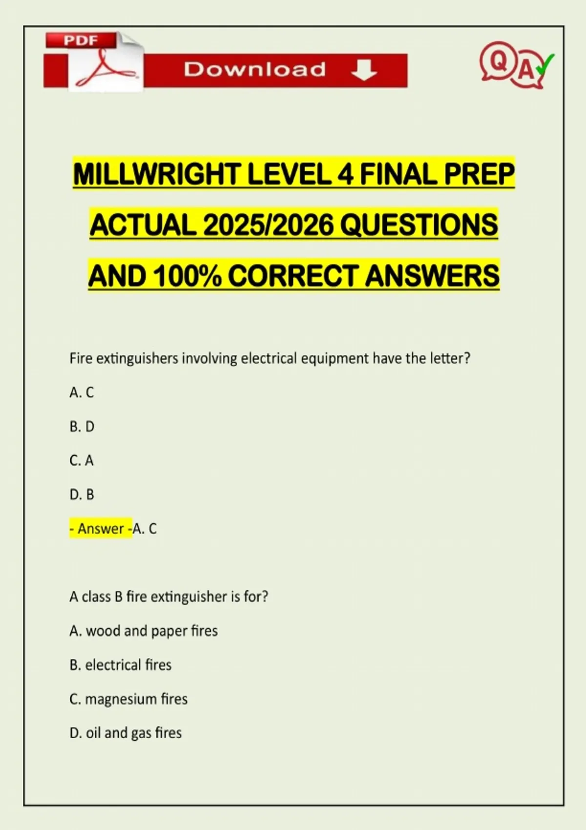 MILLWRIGHT LEVEL 4 FINAL PREP ACTUAL 2025/2026 QUESTIONS AND 100% CORRECT ANSWERS Fire extinguishers involving electrical equipment have the letter? A. C B. D C. A D. B - Answer -A. C A class B fire extinguisher is for? A. wood and paper fires B. electrical fires C. magnesium fires D. oil and gas firesNeed assistance on Online classes, Exams & Assignments? Reach out for instant help!! Full Course Assistance, Plagiarism-free Essay Writing, Research Paper, Dissertation, Discussion Posts, etc…. Confidential & Secure services. Tutors are available for all subjects! Email now at: - Answer -D. oil and gas fires A material safety data sheet must be reviewed A. once a year B. once every three years or sooner C. at the discretion of the plant safety supervisor D.every five years - Answer -B. once every three years or sooner