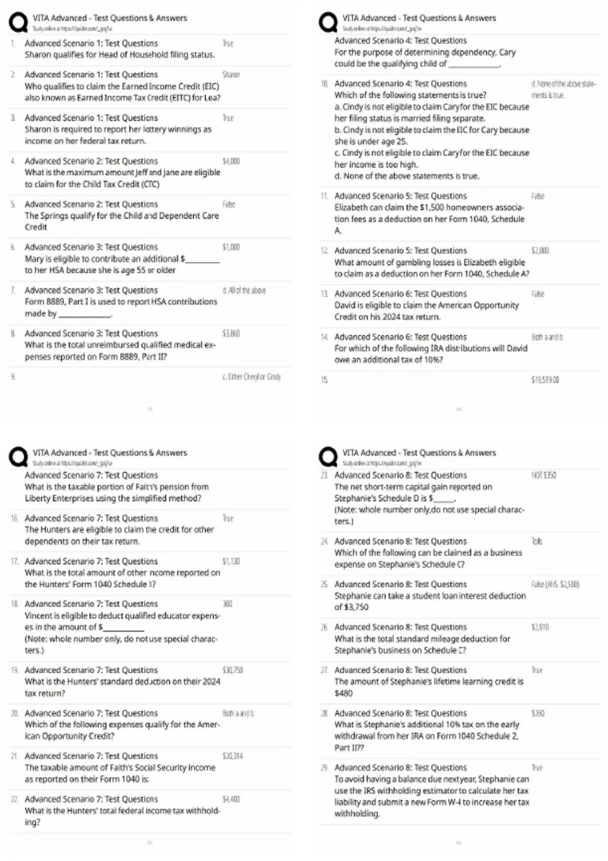 Comprehensive VITA Advanced test questions and correct answers designed to help students and tax preparers score 100% on exams and certifications. Covers advanced filing status, capital gains, credits, retirement income, AMT, and complex tax scenarios. Ideal for quizzes, test banks, exam prep, and assignments using the latest 2025 update.