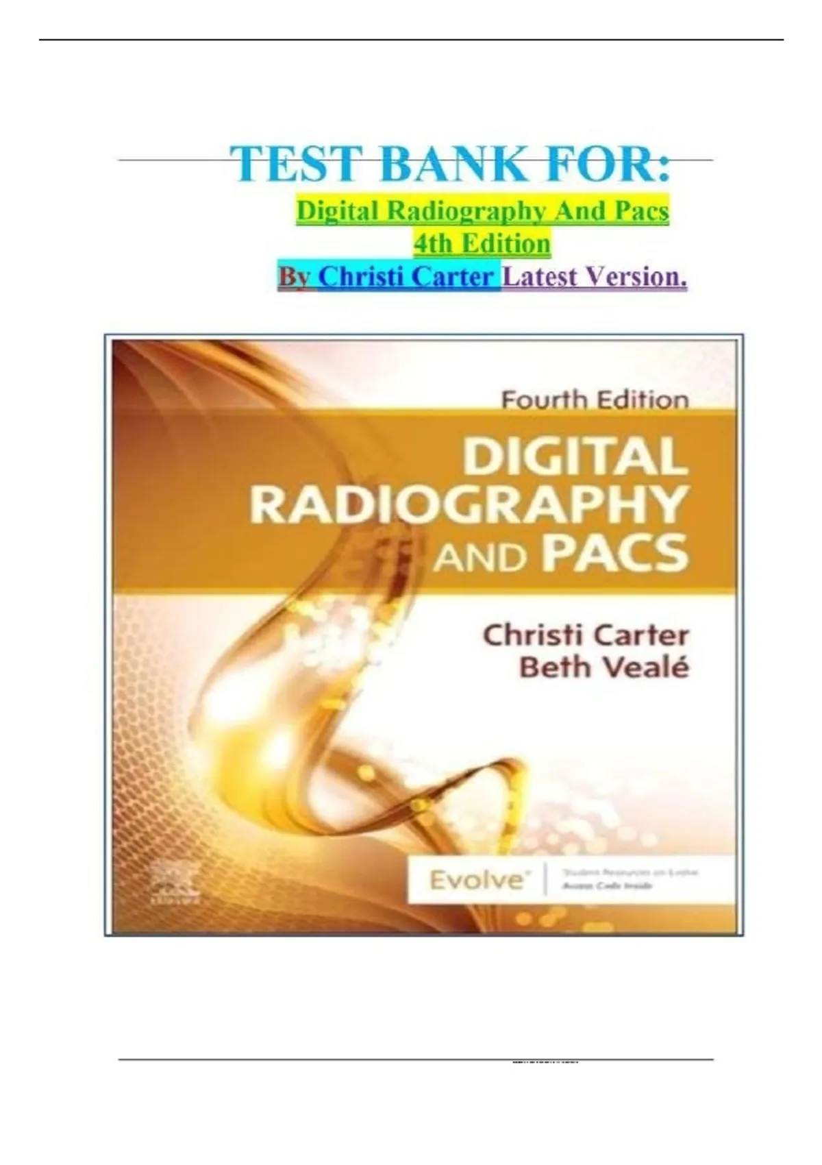 This document contains the full test bank for all 13 chapters of Digital Radiography and PACS, 3rd Edition by Carter. It includes updated questions with accurate answers and clear explanations to support strong conceptual understanding. Topics span digital imaging systems, image acquisition, PACS workflow, quality assurance, informatics, and practical applications in clinical imaging environments. The material is organized to aid exam preparation and reflects the most recent updates to the textbook