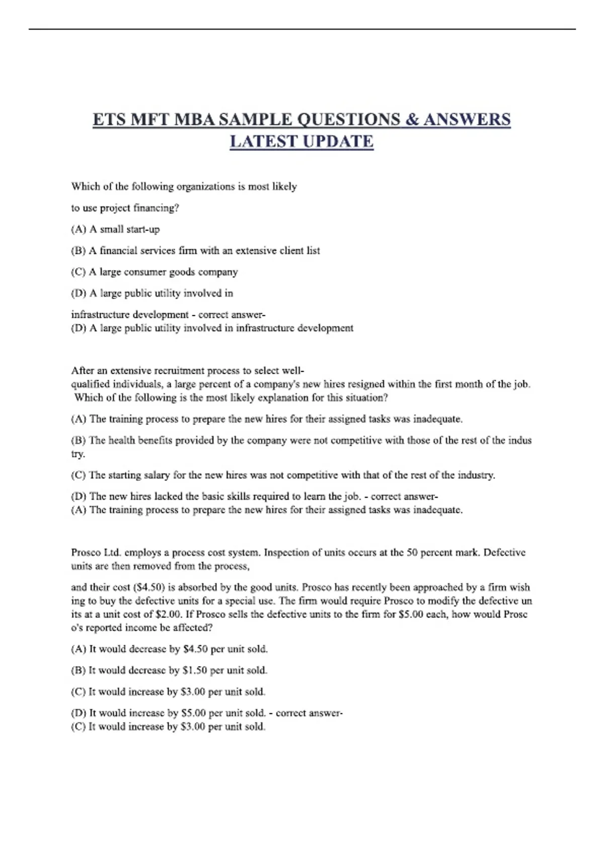 ETS MFT MBA Sample QuesThis resource contains ETS MFT MBA sample questions with verified correct answers, designed to help MBA candidates and management students prepare effectively for exams and practice & Answers – 100% Latest Update 2026 | Exam Prep & Study Guide
