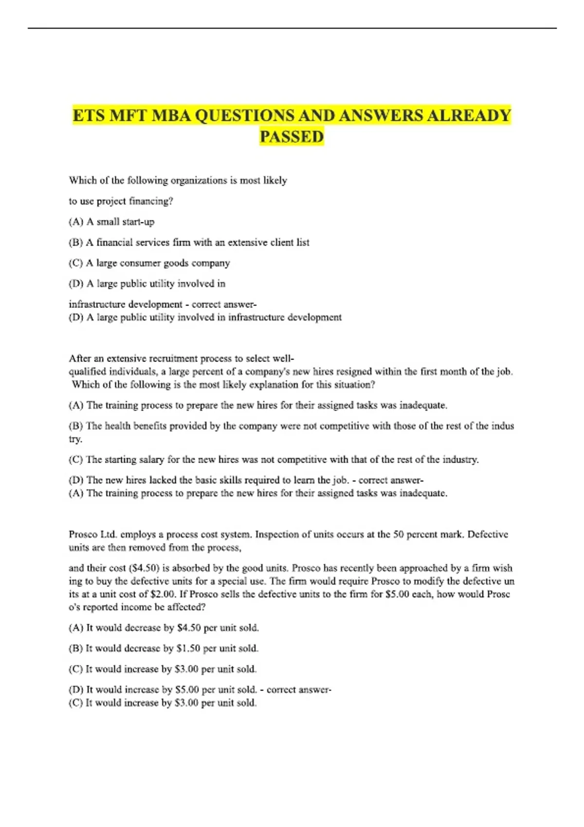 This resource provides ETS MFT MBA Questions & Answers that have been fully verified and already passed, designed for MBA students and graduate business candidates preparing for the ETS Major Field Test in Business Administration (MBA level).