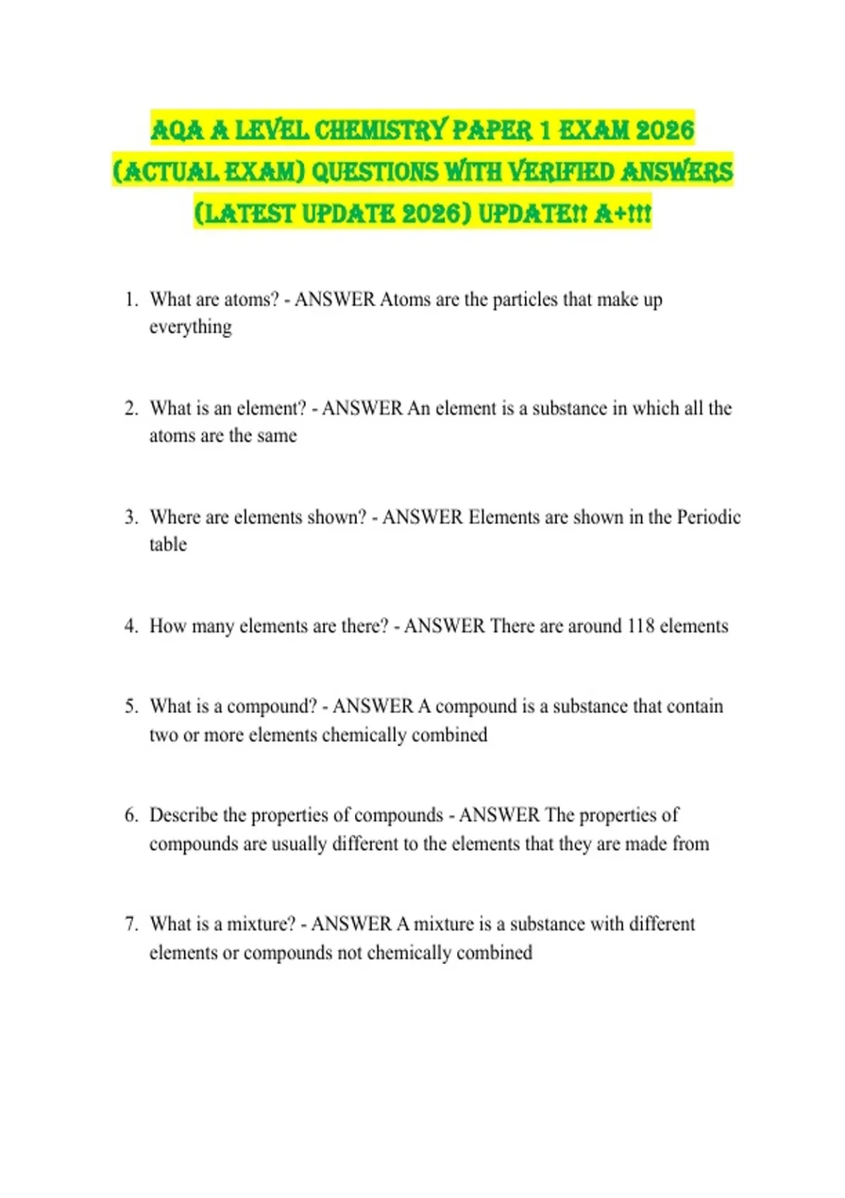 1. What are atoms? - ANSWER Atoms are the particles that make up