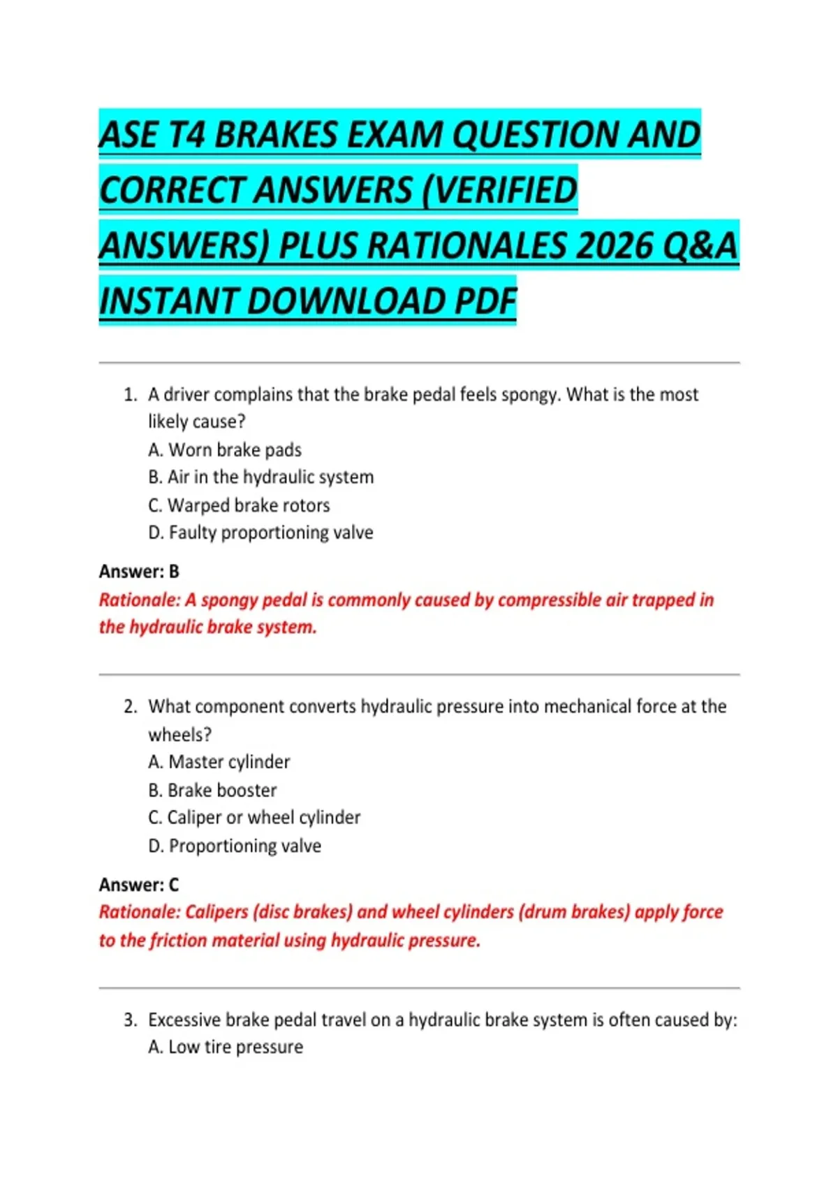 ASE T4 BRAKES EXAM QUESTION AND
