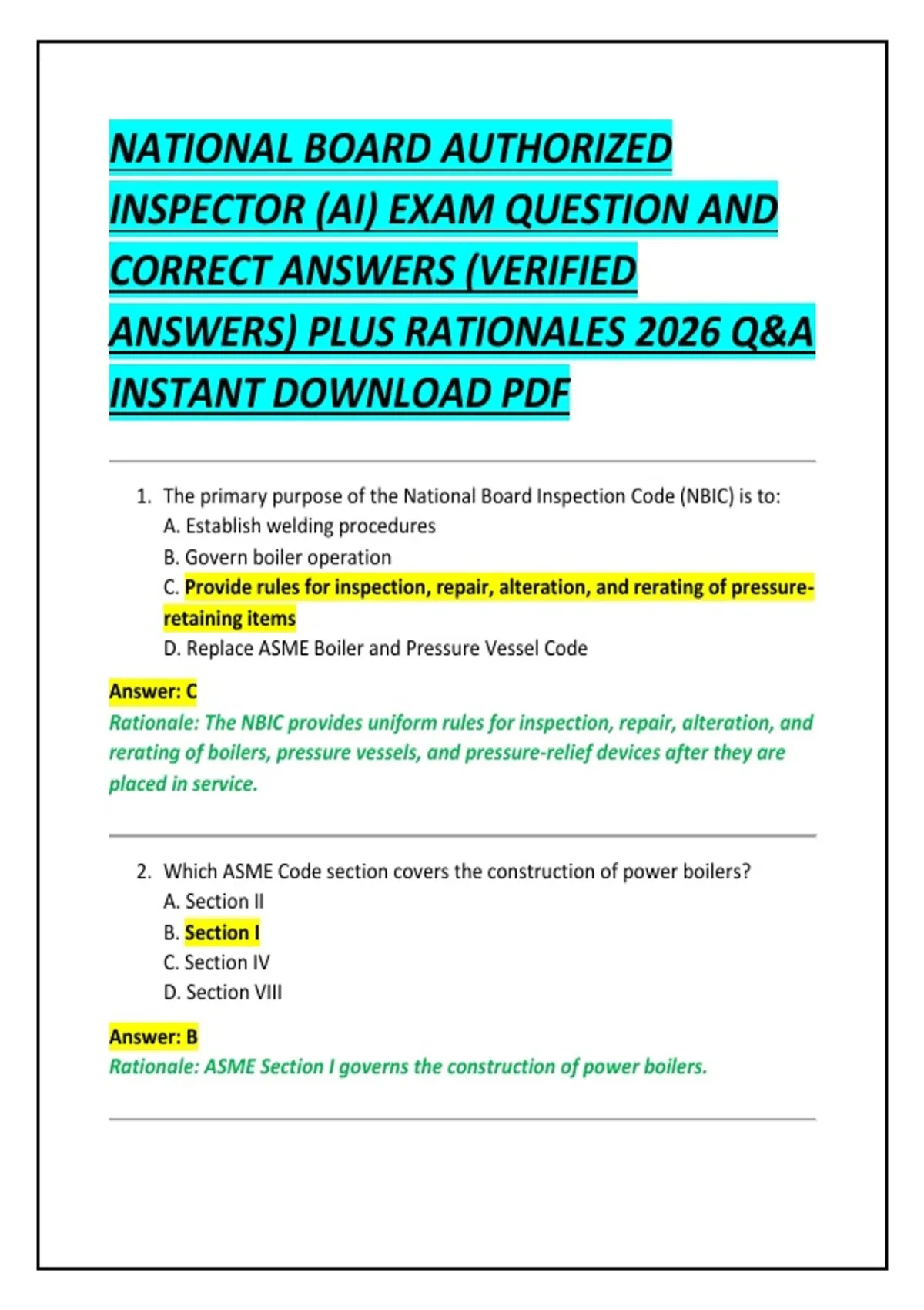 NATIONAL BOARD AUTHORIZED INSPECTOR (AI) EXAM QUESTION AND CORRECT ANSWERS (VERIFIED ANSWERS) PLUS RATIONALES 2026 Q&A INSTANT DOWNLOAD PDF