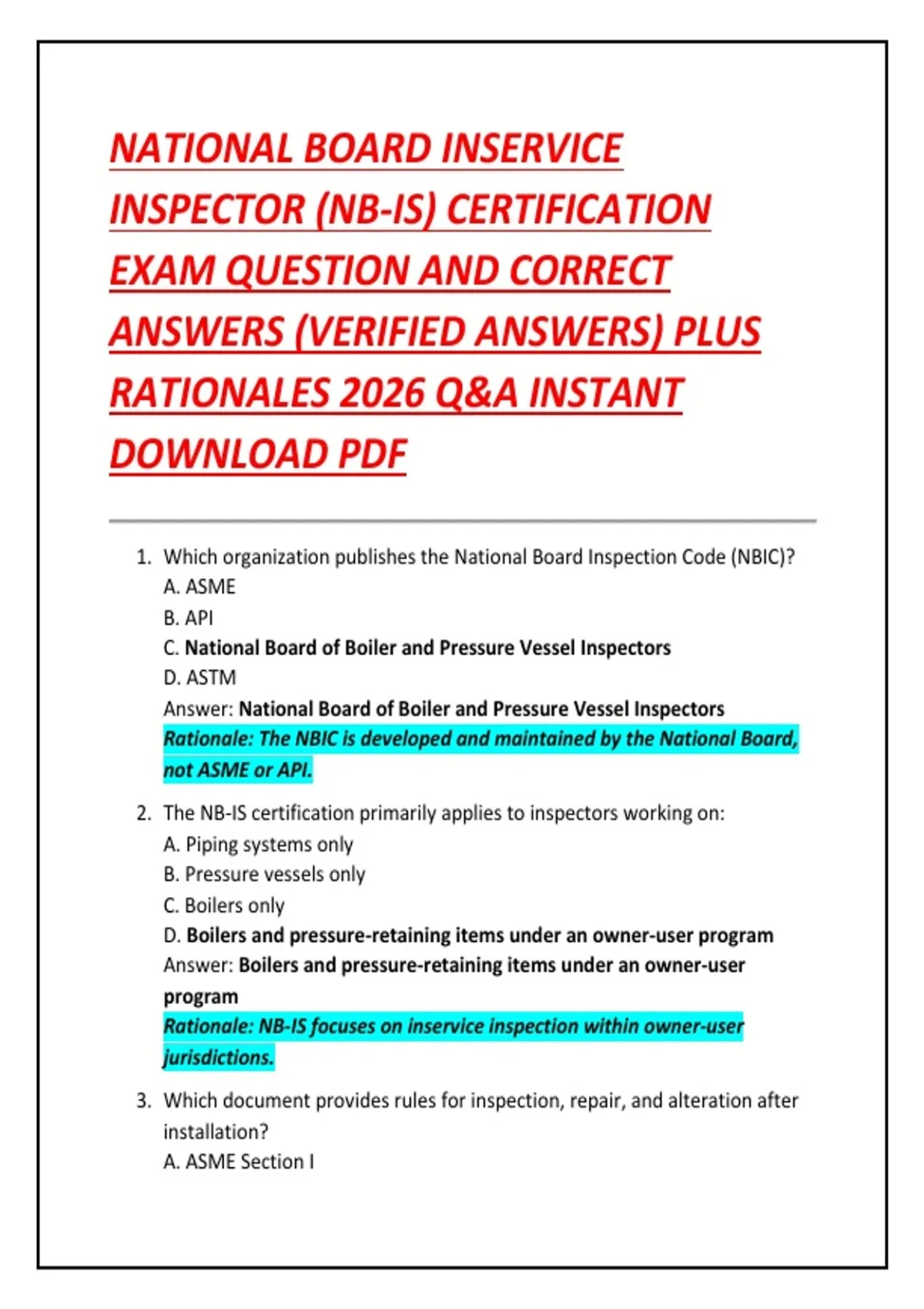 NATIONAL BOARD INSERVICE INSPECTOR (NB-IS) CERTIFICATION EXAM QUESTION AND CORRECT ANSWERS (VERIFIED ANSWERS) PLUS RATIONALES 2026 Q&A INSTANT DOWNLOAD PDF