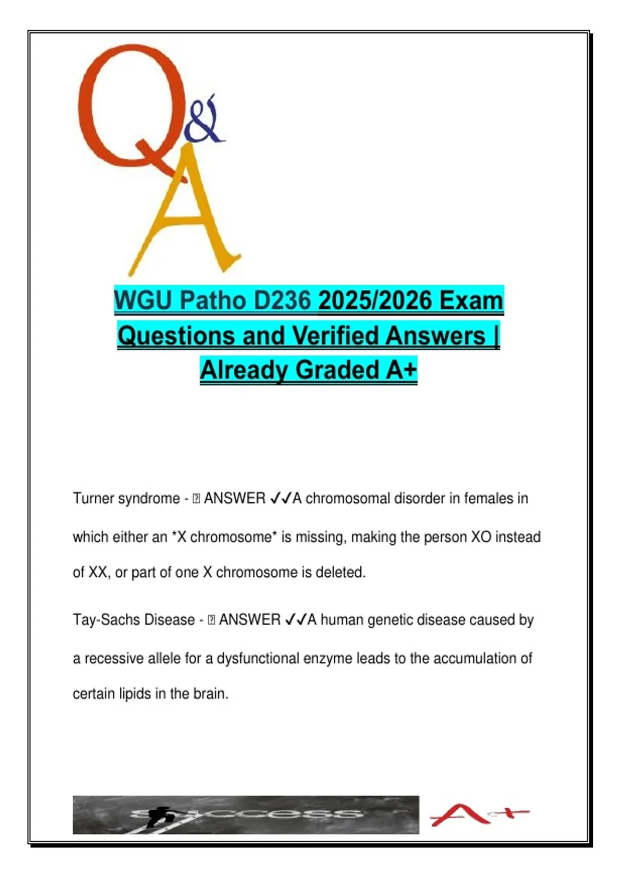 This document provides a complete exam preparation set for the WGU D236 Pathophysiology course, containing over 300+ exam-style questions and verified answers, fully updated for the 2025/2026 academic year. All content is graded A+ and includes detailed disease definitions, clinical symptoms, lab value interpretations, pharmacological associations, and physiological mechanisms. Each question is accompanied by a clear, concise answer, and many include additional clinical notes or rationales that are helpful for both theoretical learning and clinical application. Conditions span the entire body systems—from neuro and cardiovascular to endocrine and immune function—and are formatted to support NCLEX-style critical thinking and scenario-based learning. Core systems and topics covered include: Neurological disorders: ALS, Parkinson’s, MS, Alzheimer’s, seizures, Bell’s palsy Cardiovascular pathology: valve defects, murmurs, endocarditis, MI, HTN, stroke (ischemic vs hemorrhagic) Renal and electrolyte disorders: CKD, AKI, ESRD, pyelonephritis, sodium/potassium imbalances, acid-base shifts Endocrine disorders: diabetes insipidus, diabetes mellitus (Type 1 & 2), thyroid and adrenal dysfunctions, Cushing’s, Addison’s Gastrointestinal conditions: Crohn’s vs ulcerative colitis, pancreatitis, cirrhosis, GI bleeds, GERD, peptic ulcers Genetic and chromosomal diseases: Turner syndrome, Tay-Sachs, Marfan’s, Down syndrome Hematologic conditions: anemia types, leukemia, lymphadenopathy, lymphoma Respiratory conditions: COPD, asthma, respiratory infections, ABG interpretation Musculoskeletal and trauma: fractures, strains/sprains, bursitis, osteoarthritis, spinal injuries Immunology and cancer: HIV/AIDS, autoimmune diseases, cancer markers (e.g., HE4), tumor effects Integumentary and burns: rule of 9s, degrees of burn, trauma-related fluid shifts Lab diagnostics & interpretation: ABGs, CBC, BMP, urinalysis, hormonal markers, tumor markers Ideal for: WGU nursing students in D236 or comparable pathophysiology courses Students preparing for proctored exams, finals, or clinical knowledge checks NCLEX, HESI, ATI, or TEAS prep Allied health and pre-nursing majors Nurse educators and tutors seeking high-yield question banks The document reflects realistic clinical vignettes, emphasizes critical reasoning, and integrates lab + patho to simulate patient-centered questions found on board and licensure exams. Keywords: D236, pathophysiology, WGU, 2025, NCLEX, cardiac murmurs, COPD, diabetes, Addison’s, Cushing’s, ABG, anemia, kidney failure, electrolyte imbalance, stroke, hypertension, ALS, HIV, burns, lab values, endocrine disorders, GI disorders, autoimmune, Turner syndrome, Tay-Sachs, thyroid disorders, heart valve disease, cancer markers