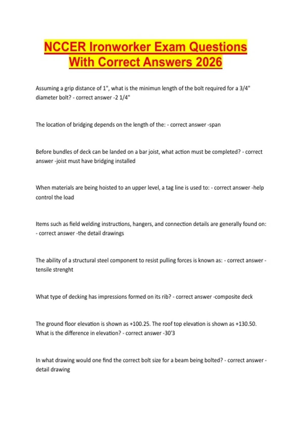 NCCER Ironworker Exam Questions With Correct Answers 2026