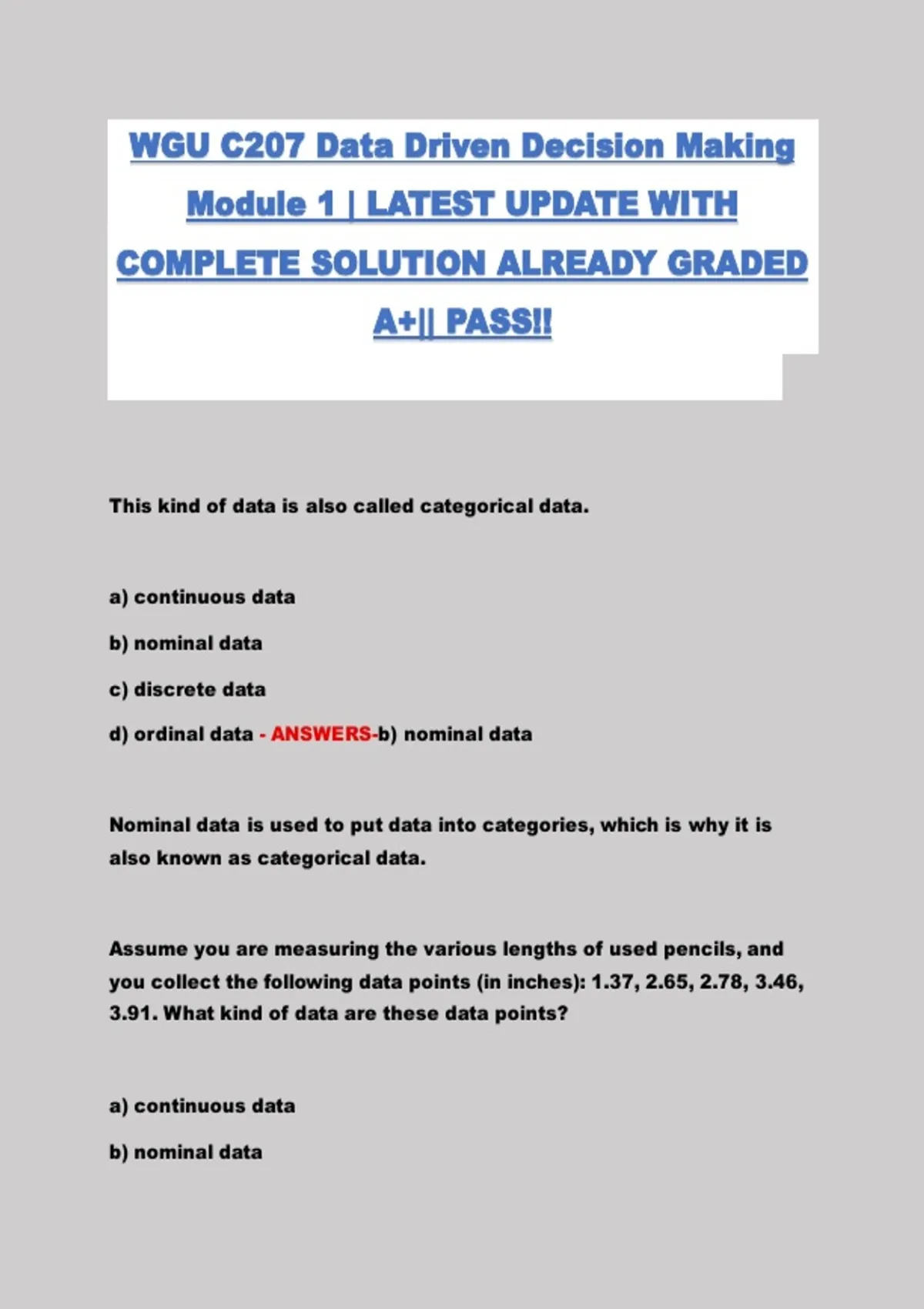 WGU C207 Data Driven Decision Making Module 1 | LATEST UPDATE WITH COMPLETE SOLUTION ALREADY GRADED A+|| PASS!!