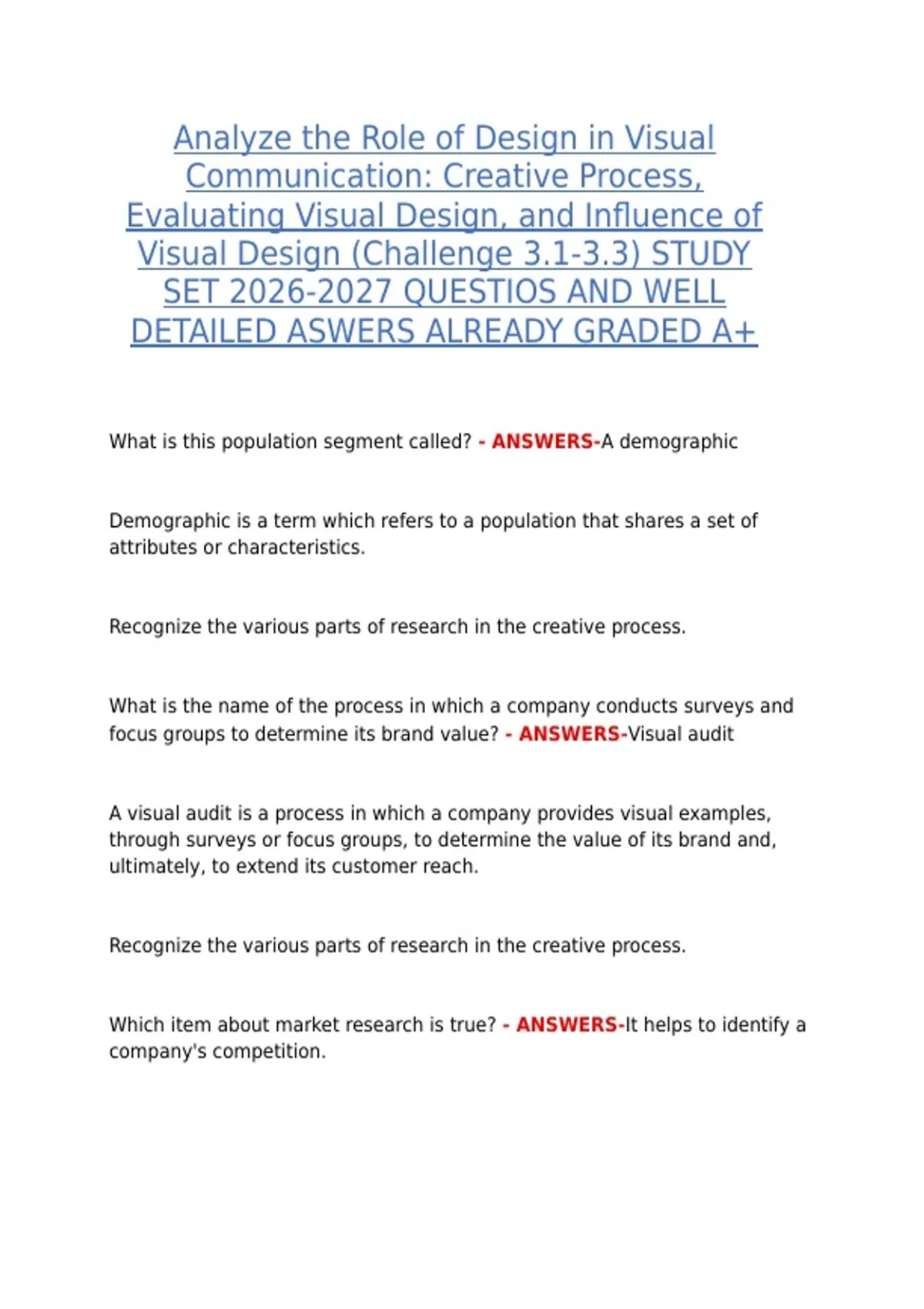 Analyze the Role of Design in Visual Communication: Creative Process, Evaluating Visual Design, and Influence of Visual Design (Challenge 3.1-3.3) STUDY SET QUESTIOS AND WELL DETAILED ASWERS ALREADY GRADED A+