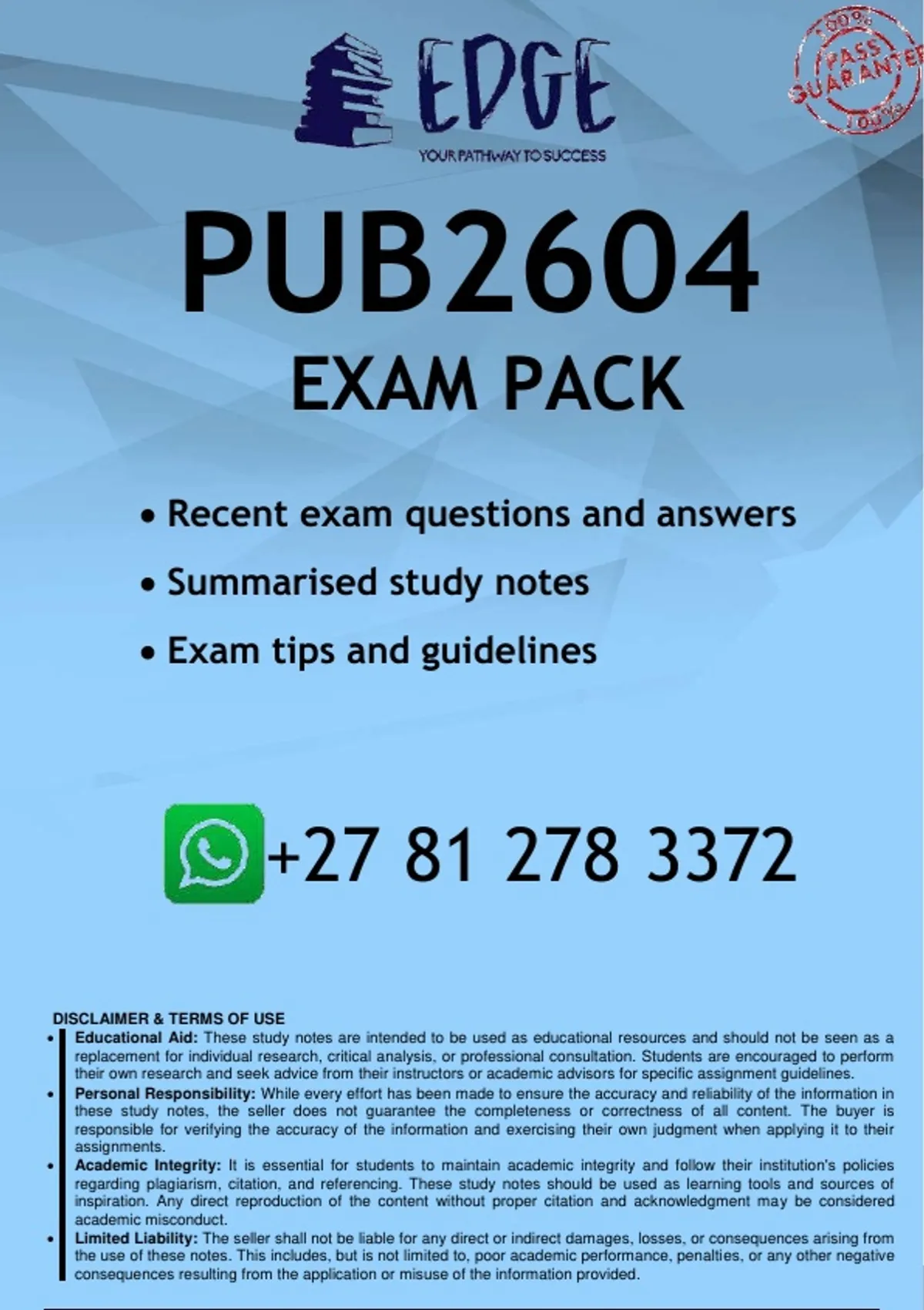 Well-structured PUB2604 EXAM PREPARATION PACK - DISTINCTION GUARANTEED. Contains recent exam questions and answers, and Summarised study notes. All you need to pass the 2026 EXAMS