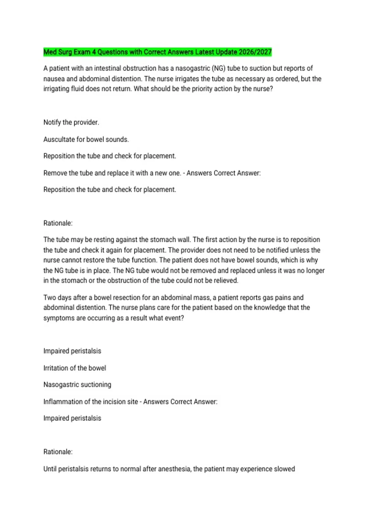 Med Surg Exam 4 Questions with Correct Answers Latest Update 2026/2027 A patient with an intestinal obstruction has a nasogastric (NG) tube to suction but reports of nausea and abdominal distention. The nurse irrigates the tube as necessary as ordered, but the irrigating fluid does not return. What should be the priority action by the nurse? Notify the provider. Auscultate for bowel sounds. Reposition the tube and check for placement. Remove the tube and replace it with a new one. - Answers Correct Answer: Reposition the tube and check for placement. Rationale: The tube may be resting against the stomach wall. The first action by the nurse is to reposition the tube and check it again for placement. The provider does not need to be notified unless the nurse cannot restore the tube function. The patient does not have bowel sounds, which is why the NG tube is in place. The NG tube would not be removed and replaced unless it was no longer in the stomach or the obstruction of the tube could not be relieved. Two days after a bowel resection for an abdominal mass, a patient reports gas pains and abdominal distention. The nurse plans care for the patient based on the knowledge that the symptoms are occurring as a result what event? Impaired peristalsis Irritation of the bowel Nasogastric suctioning Inflammation of the incision site - Answers Correct Answer: Impaired peristalsis Rationale: Until peristalsis returns to normal after anesthesia, the patient may experience slowed gastrointestinal motility, leading to gas pains and abdominal distention. Irritation of the bowel, nasogastric suctioning, and inflammation of the surgical site do not cause gas pains or abdominal distention. A patient is planned for discharge home today after ostomy surgery for colon cancer. The nurse should assign the patient to which staff member? An UAP on the unit who has hospice experience An LPN that has worked on the unit for 10 years An RN with 6 months of experience on the surgical unit An RN who has floated to the surgical unit from pediatrics - Answers Correct Answer: An RN with 6 months of experience on the surgical unit Rationale: The patient needs ostomy care directions and reinforcement at discharge and should be assigned to a registered nurse with experience in providing discharge teaching for ostomy care. Teaching should not be delegated to a LPN/VN or UAP. The nurse is conducting discharge teaching for a patient with metastatic lung cancer who was admitted with a bowel impaction. Which instructions would be most helpful to prevent further episodes of constipation? Maintain a high intake of fluid and fiber in the diet. Discontinue intake of medications causing constipation. Eat several small meals per day to maintain bowel motility. Sit upright during meals to increase bowel motility by gravity. - Answers Correct Answer: Maintain a high intake of fluid and fiber in the diet. Rationale: Increased fluid intake and a high-fiber diet reduce the incidence of constipation caused by immobility, medications, and other factors. Fluid and fiber provide bulk that in turn increases peristalsis and bowel motility. Analgesics taken for lung cancer probably cannot be discontinued. Eating several small meals per day and position do not facilitate bowel motility. A patient is given a bisacodyl suppository and asks the nurse how long it will take to work. What is the best response by the nurse?