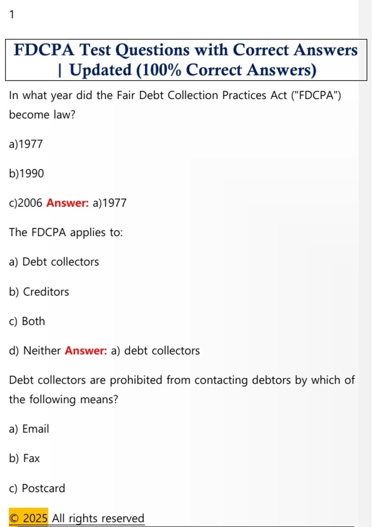 FDCPA Test Questions with Correct Answers
