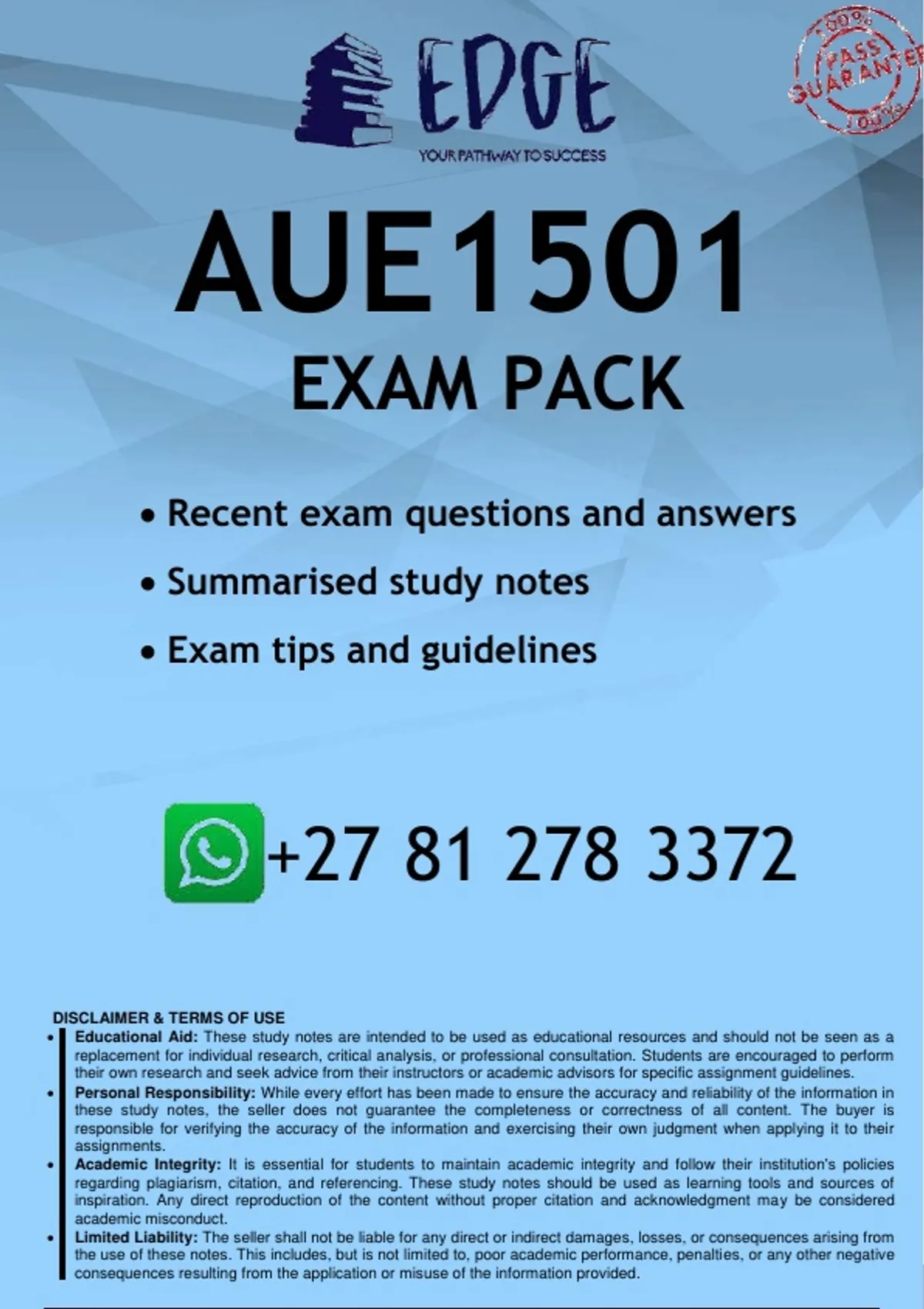 Well-structured AUE1501 EXAM PREPARATION PACK - DISTINCTION GUARANTEED. Contains recent exam questions and answers, and Summarised study notes. All you need to pass the 2026 EXAMS