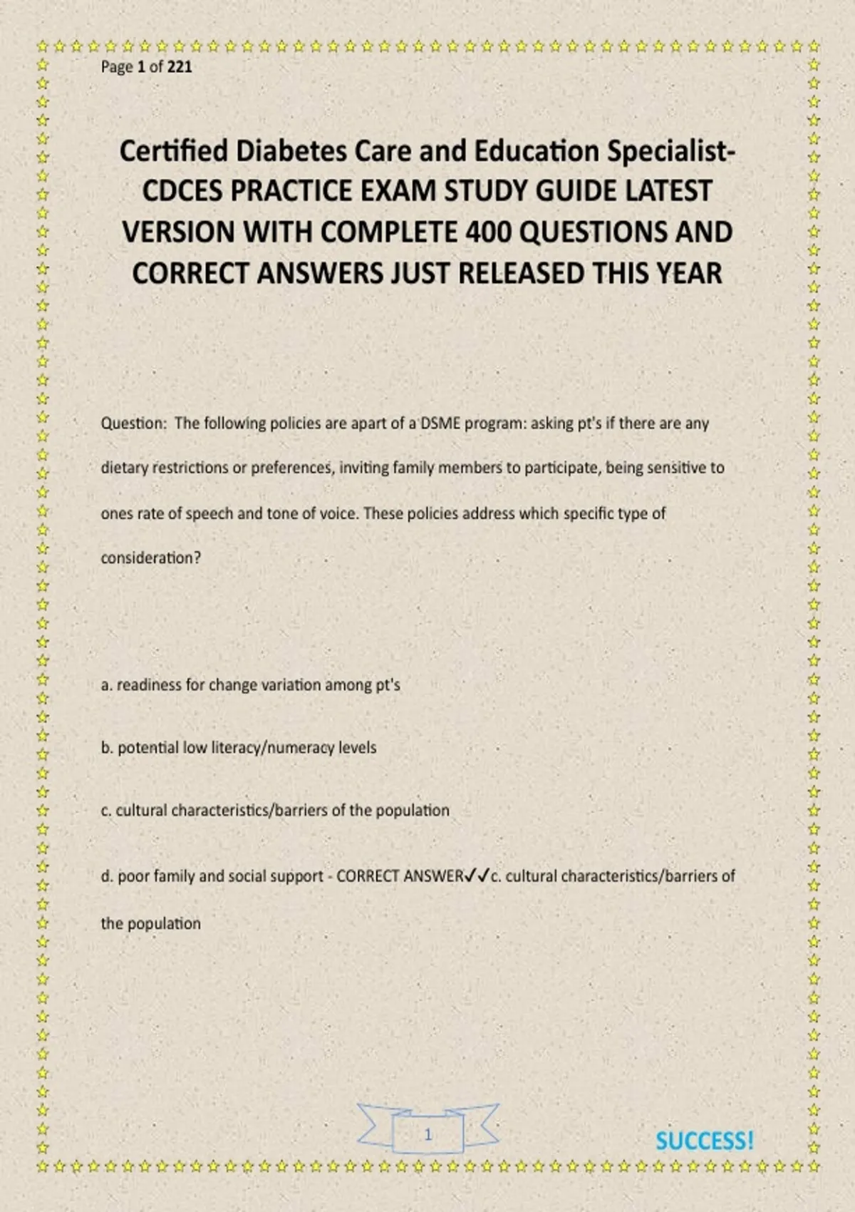 Certified Diabetes Care and Education Specialist-CDCES PRACTICE EXAM STUDY GUIDE LATEST VERSION WITH COMPLETE 400 QUESTIONS AND CORRECT ANSWERS JUST RELEASED THIS YEAR