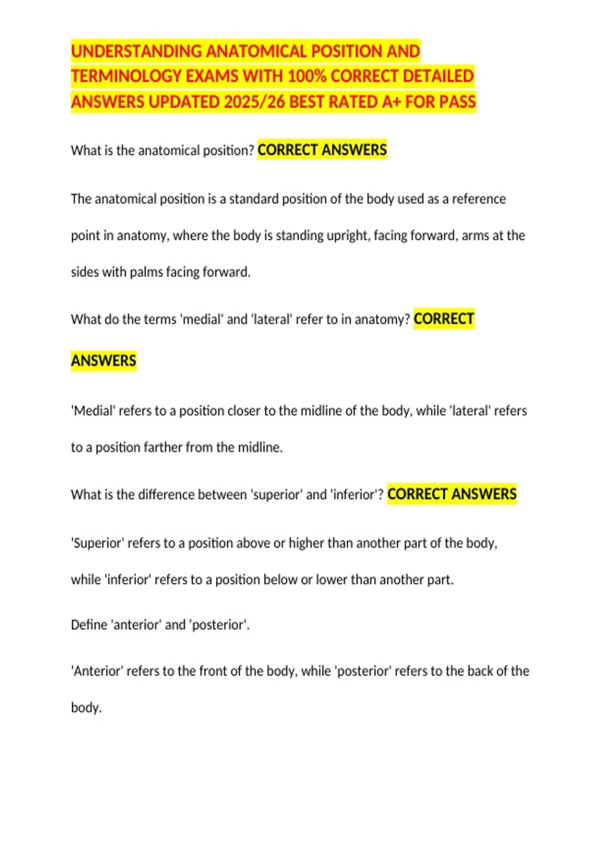 UNDERSTANDING ANATOMICAL POSITION AND TERMINOLOGY EXAMS WITH 100% CORRECT DETAILED ANSWERS UPDATED 2025/26 BEST RATED A+ FOR PASS