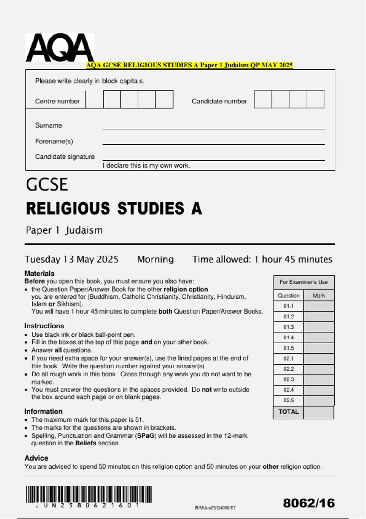 AQA GCSE RELIGIOUS STUDIES A Paper 1 Judaism QP MAY 2025