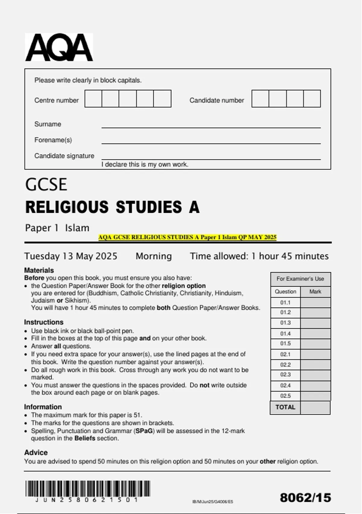 AQA GCSE RELIGIOUS STUDIES A Paper 1 Islam QP MAY 2025