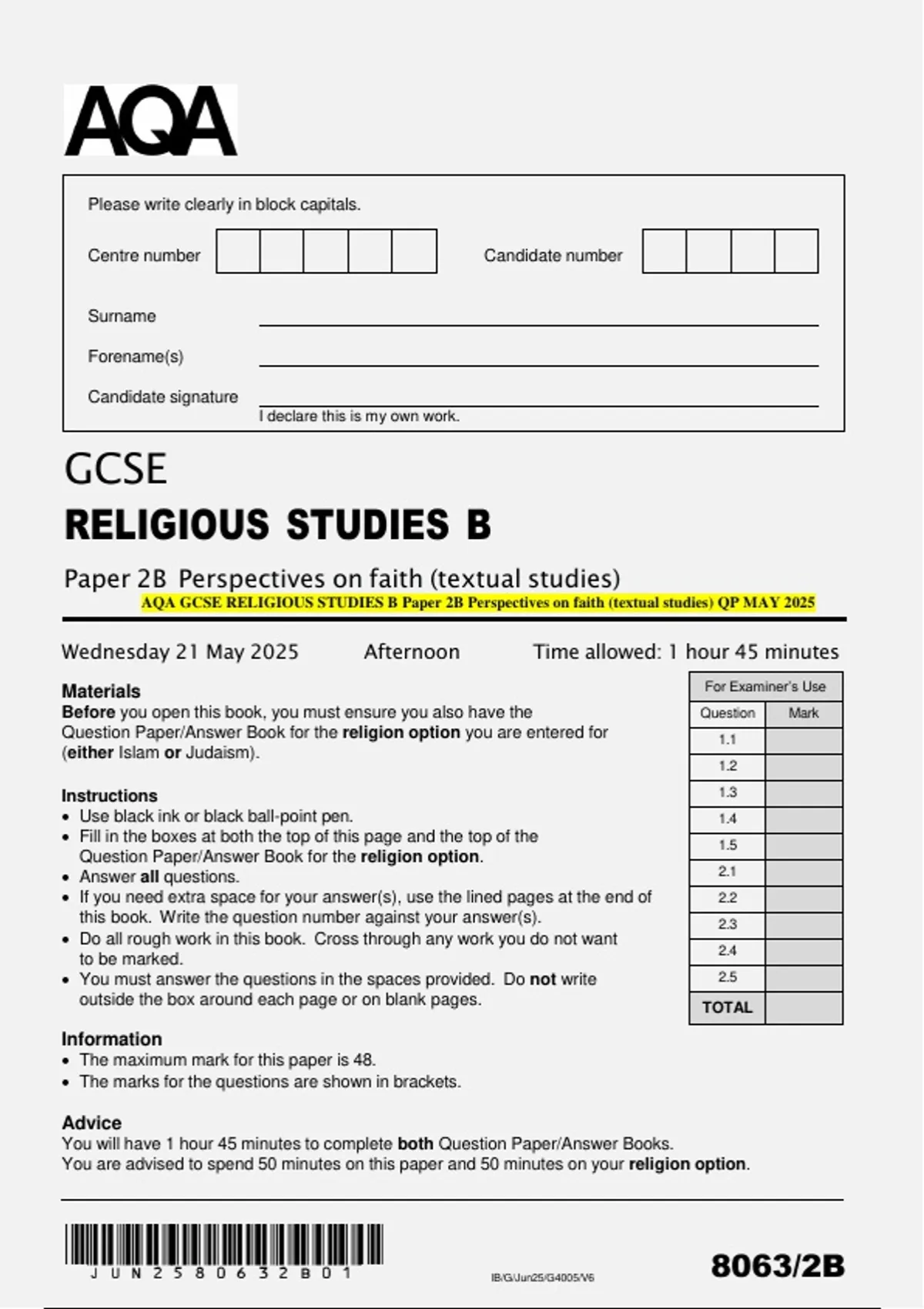 AQA GCSE RELIGIOUS STUDIES B Paper 2B Perspectives on faith (textual studies) QP MAY 2025