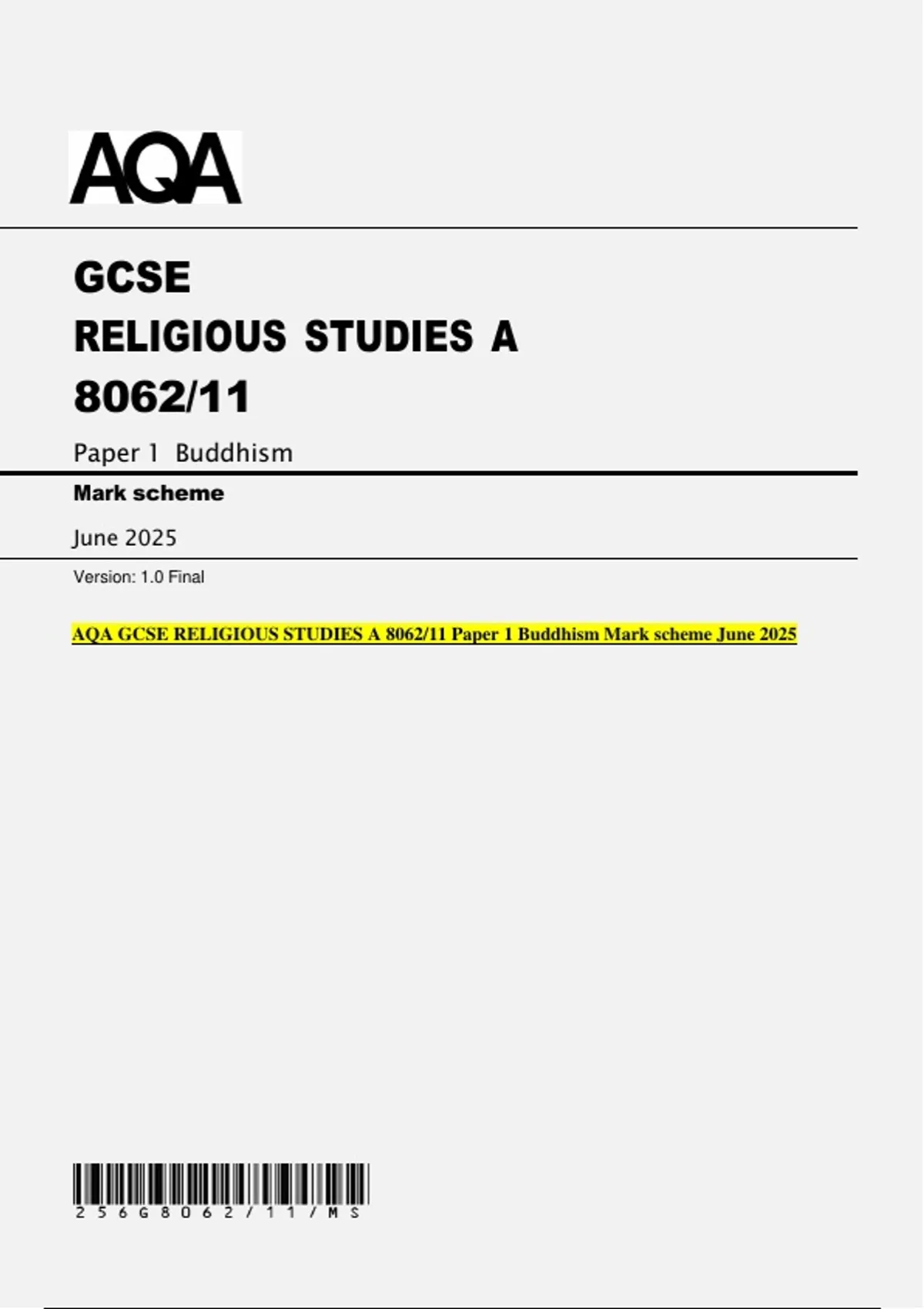 AQA GCSE RELIGIOUS STUDIES A 8062/11 Paper 1 Buddhism Mark scheme June 2025