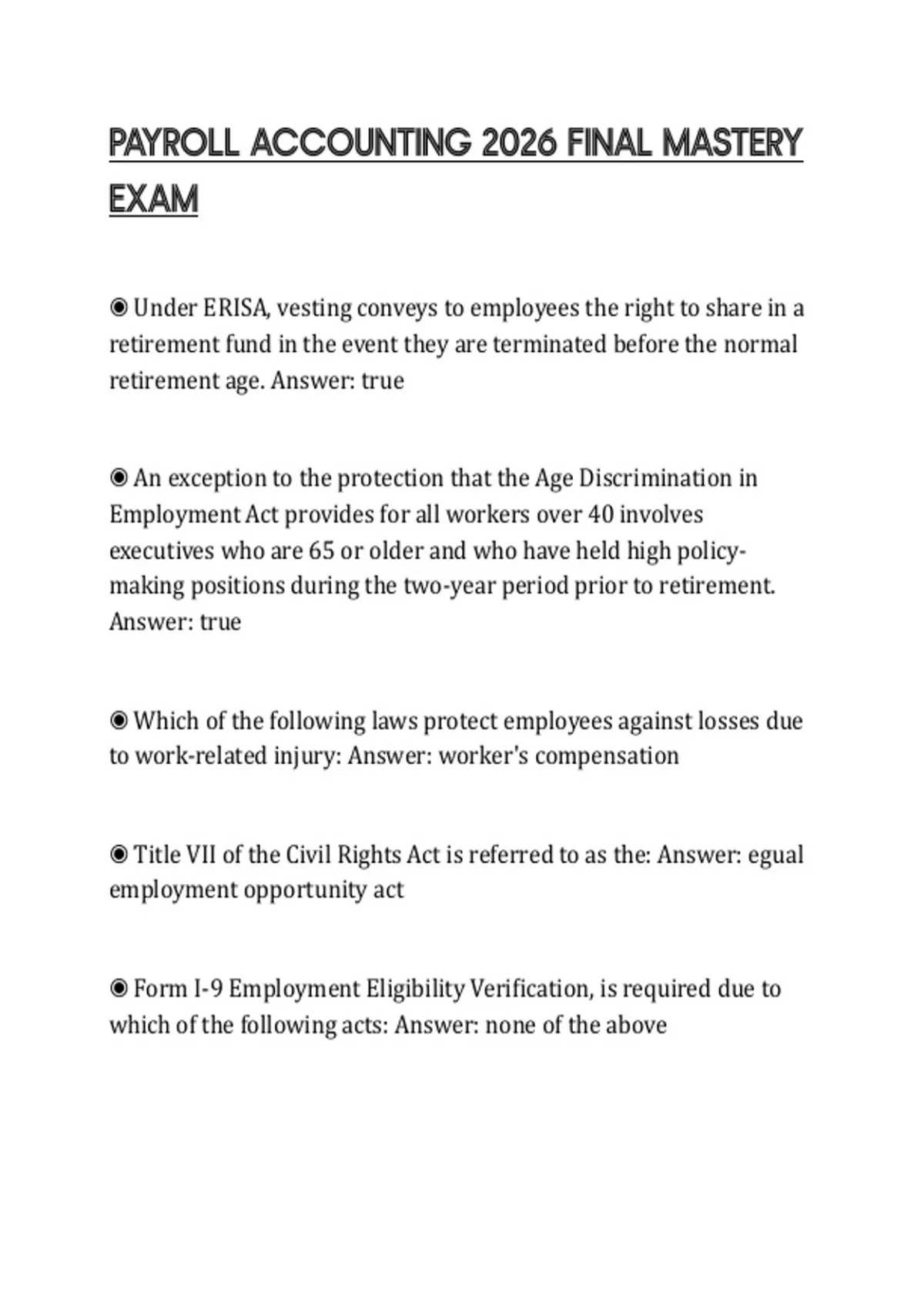 ◉ Title VII of the Civil Rights Act is referred to as the: Answer: egual