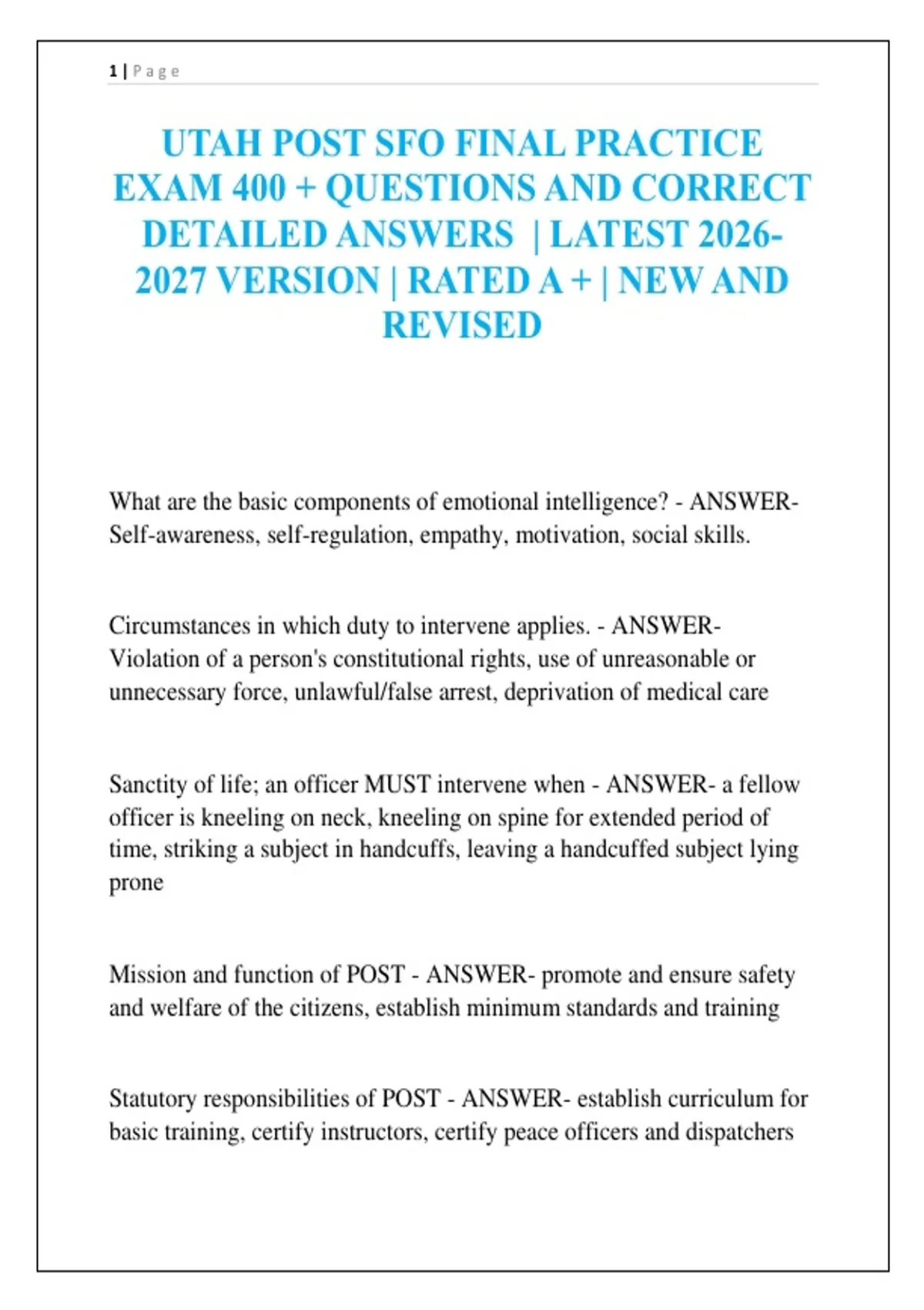 UTAH POST SFO FINAL PRACTICE EXAM 400 + QUESTIONS AND CORRECT DETAILED ANSWERS | LATEST 2026- 2027 VERSION | RATED A + | NEW AND REVISED