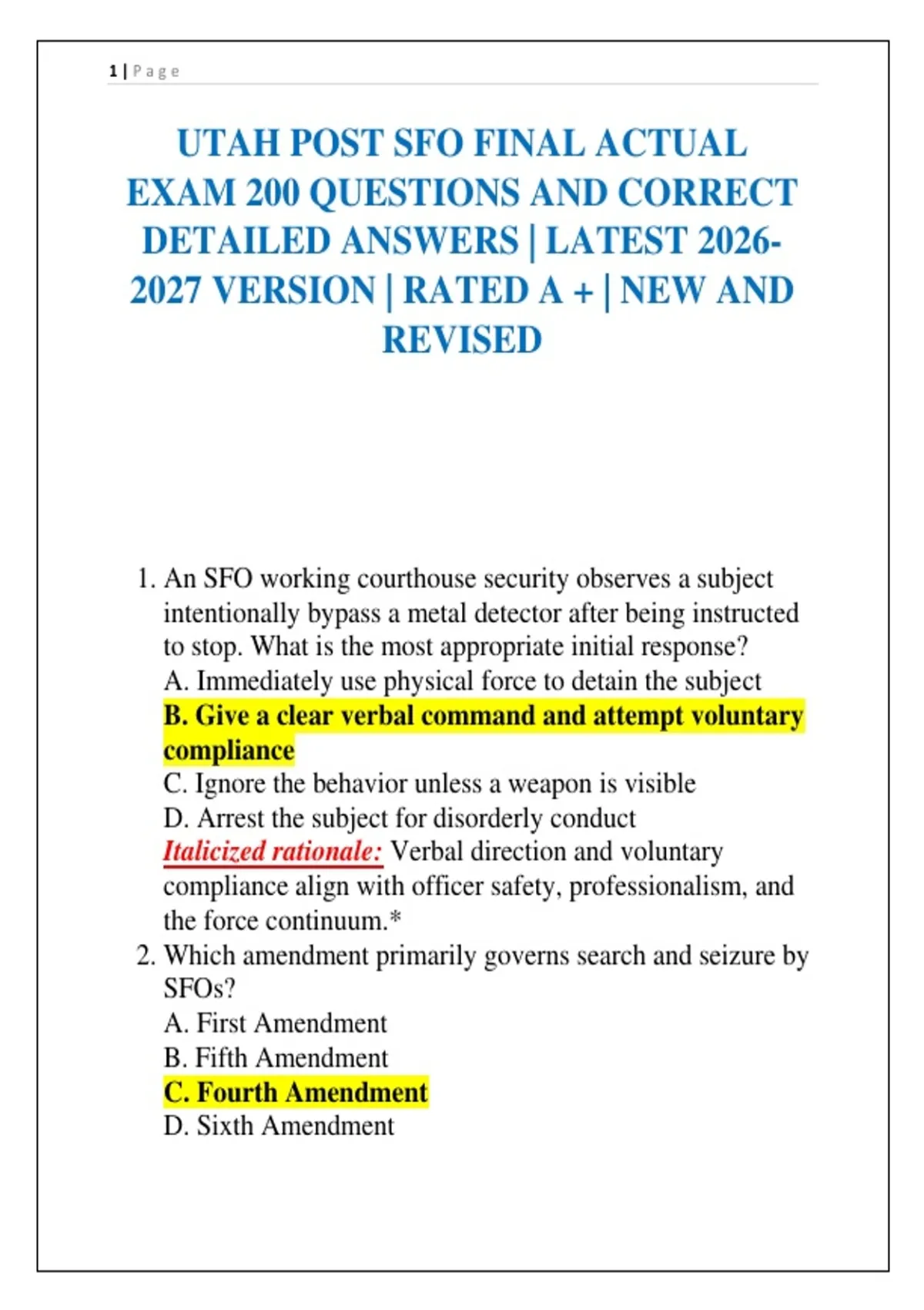 UTAH POST SFO FINAL ACTUAL EXAM 200 QUESTIONS AND CORRECT DETAILED ANSWERS | LATEST 2026- 2027 VERSION | RATED A + | NEW AND REVISED
