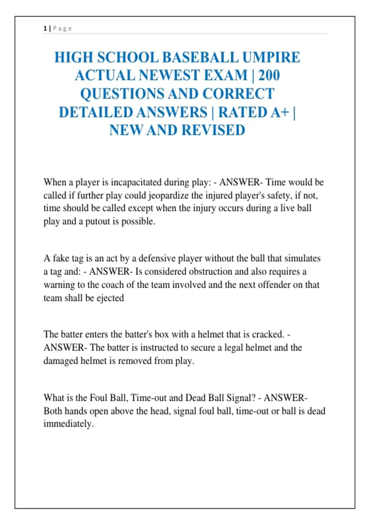 HIGH SCHOOL BASEBALL UMPIRE ACTUAL NEWEST EXAM | 200 QUESTIONS AND CORRECT DETAILED ANSWERS | RATED A+ | NEW AND REVISED