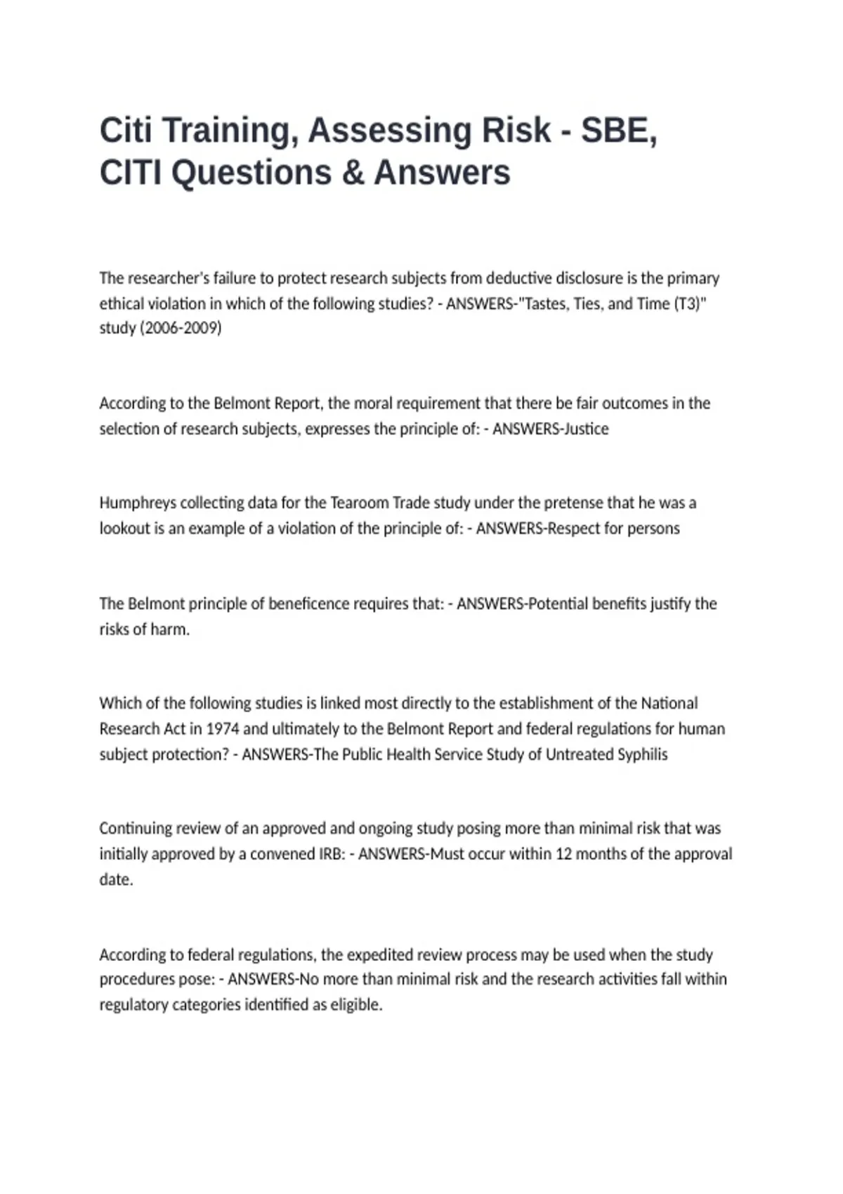 Citi Training, Assessing Risk - SBE, CITI Questions & Answers