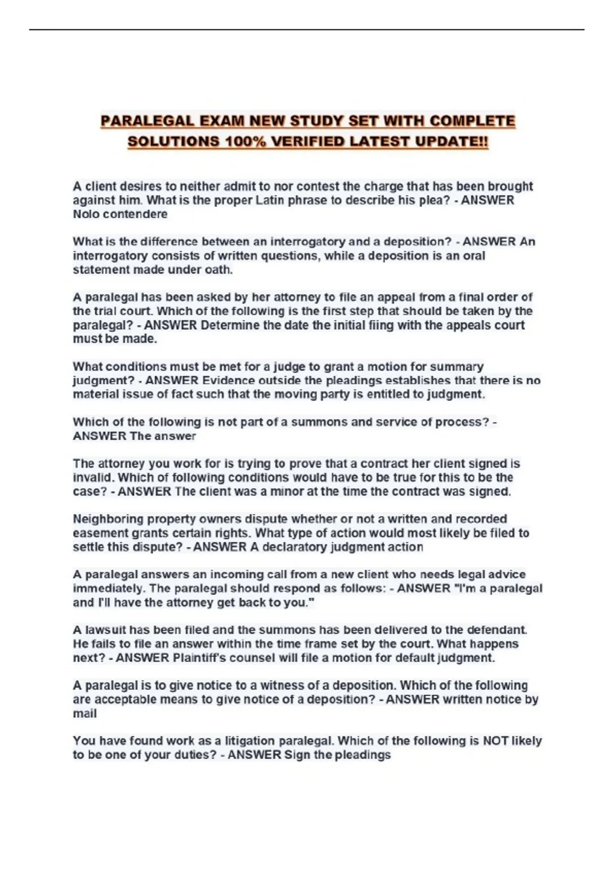 PARALEGAL EXAM NEW STUDY SET WITH COMPLETE SOLUTIONS 100% VERIFIED LATEST UPDATE!!...