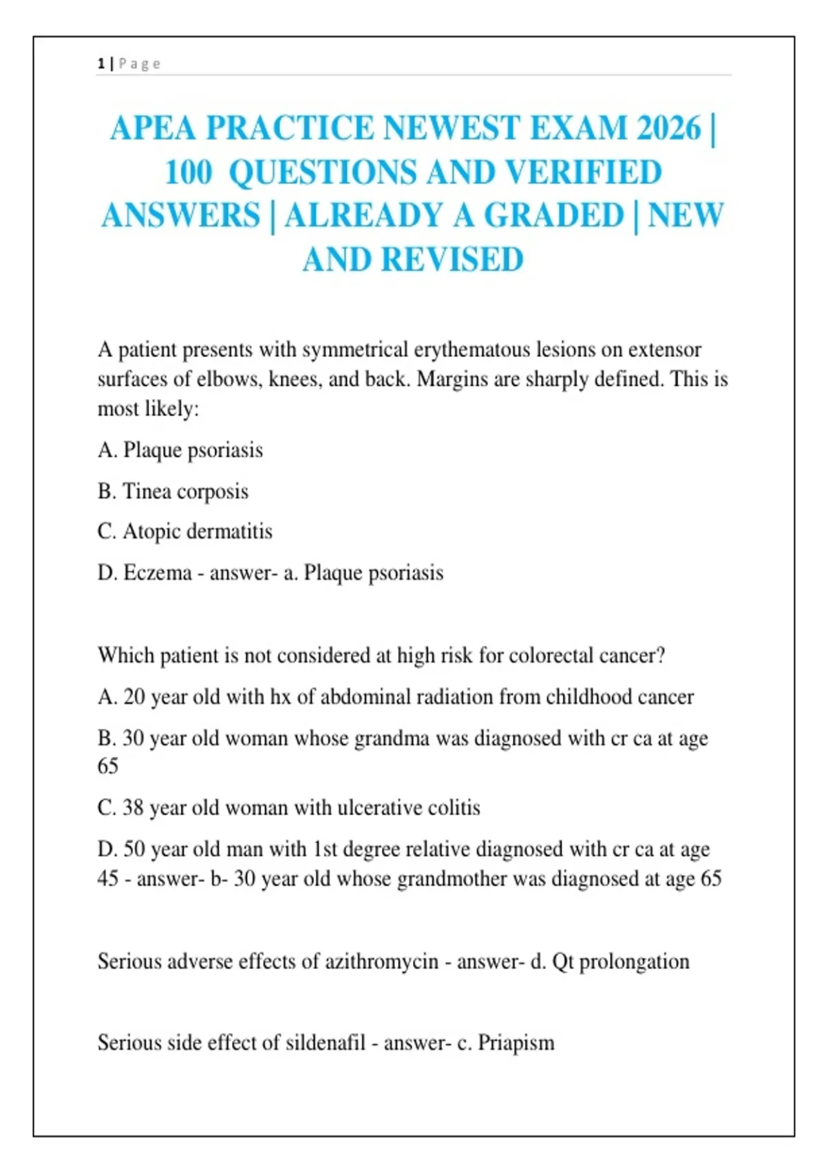 APEA PRACTICE NEWEST EXAM 2026 | 100 QUESTIONS AND VERIFIED ANSWERS | ALREADY A GRADED | NEW AND REVISED
