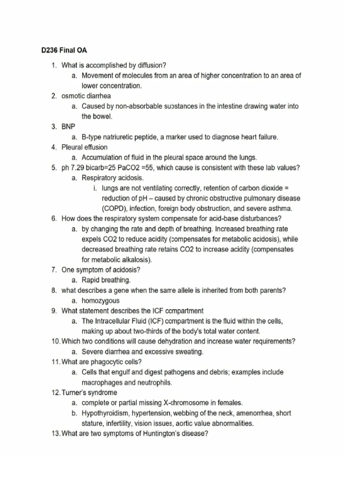 Achieve mastery over complex clinical concepts with this 2026 updated exam bank for WGU D236 Pathophysiology. This resource features verified questions and answers that target the most challenging domains of the Objective Assessment. You will gain technical precision in interpreting acid-base disturbances, specifically identifying respiratory acidosis through pH and PaCO2 lab values and understanding the respiratory system's compensatory mechanisms. The guide provides surgical detail on critical biomarkers, such as BNP for heart failure and HE4 for ovarian cancer, alongside a deep dive into systemic conditions like Rhabdomyolysis and its impact on renal function. From defining the characteristics of prerenal dysfunction to recognizing the symptoms of Acute Lymphocytic Leukemia in pediatric patients, this toolkit ensures you possess the clinical depth required for success. These verified solutions provide the pedagogical support necessary to pass your OA on the first attempt.