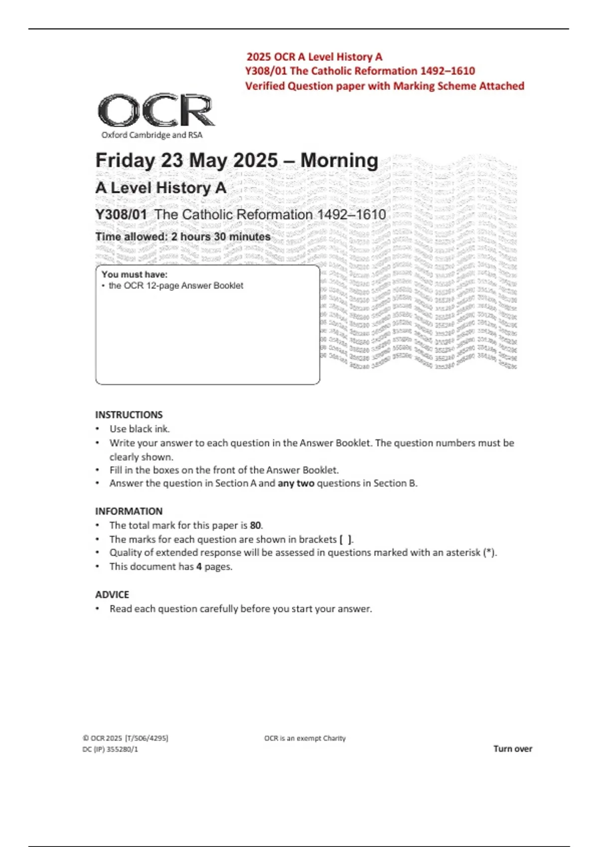 2025 OCR A Level History A Y308-01 The Catholic Reformation 1492–1610