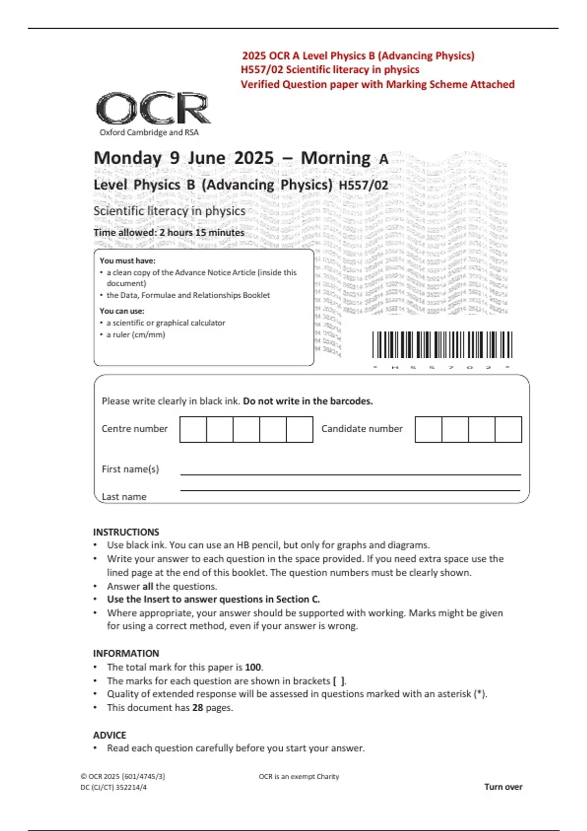 2025 OCR Physics B (Advancing Physics) H557-02 Scientific Literacy in Physics Question Paper | Marking Scheme Attached | Verified