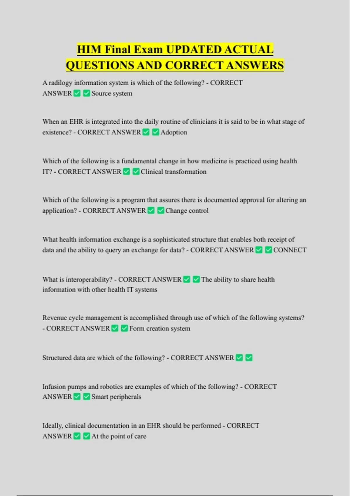 HIM Final Exam UPDATED ACTUAL QUESTIONS AND CORRECT ANSWERS A radilogy information system is which of the following? - CORRECT ANSWER Source system When an EHR is integrated into the daily routine of clinicians it is said to be in what stage of existence? - CORRECT ANSWER Adoption Which of the following is a fundamental change in how medicine is practiced using health IT? - CORRECT ANSWER Clinical transformation Which of the following is a program that assures there is documented approval for altering an application? - CORRECT ANSWER Change control What health information exchange is a sophisticated structure that enables both receipt of data and the ability to query an exchange for data? - CORRECT ANSWER What is interoperability? - CORRECT ANSWER CONNECT The ability to share health information with other health IT systems Revenue cycle management is accomplished through use of which of the following systems? - CORRECT ANSWER Form creation system Structured data are which of the following? - CORRECT ANSWER Infusion pumps and robotics are examples of which of the following? - CORRECT ANSWER Smart peripherals