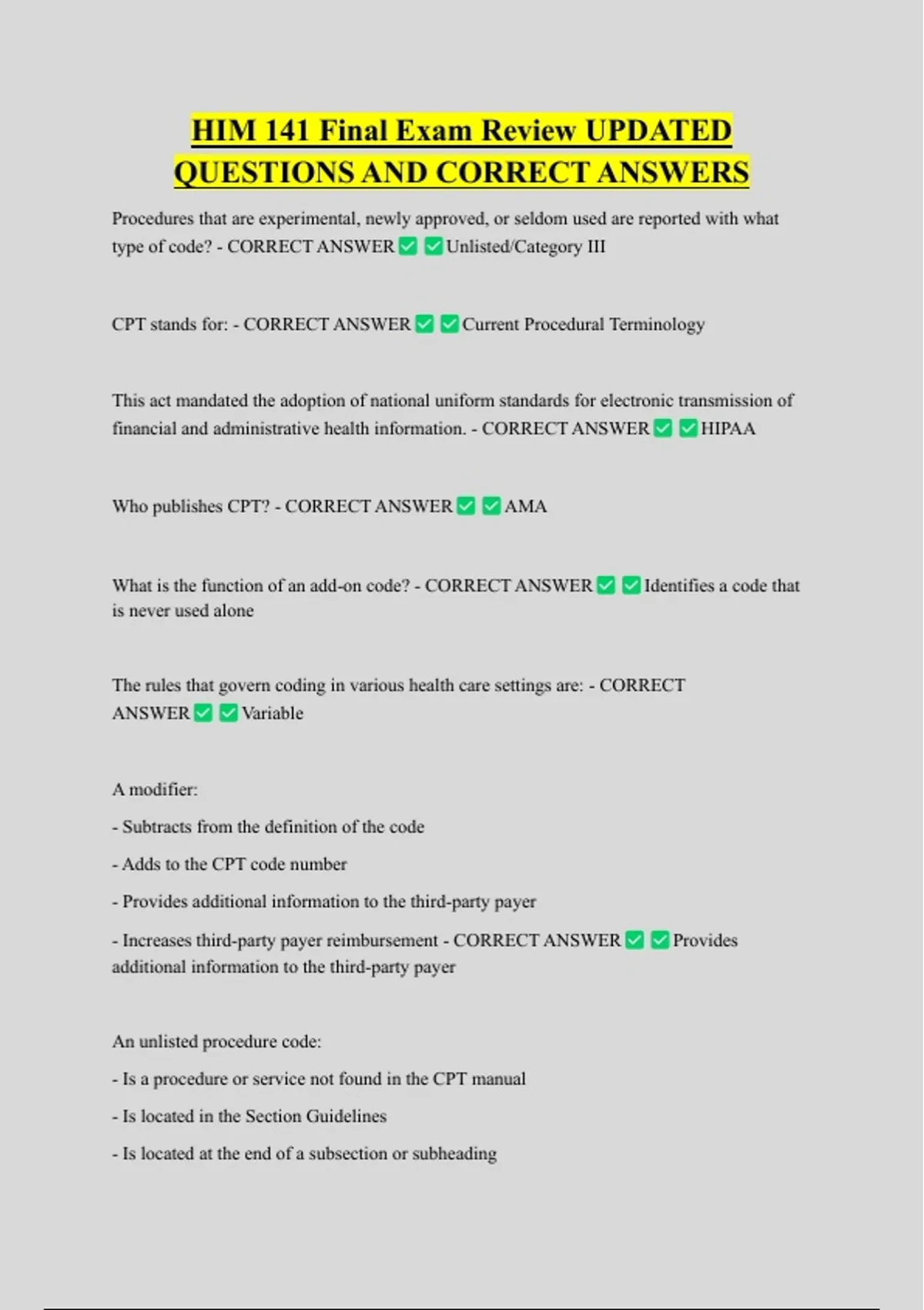 HIM 141 Final Exam Review UPDATED QUESTIONS AND CORRECT ANSWERS Procedures that are experimental, newly approved, or seldom used are reported with what type of code? - CORRECT ANSWER Unlisted/Category III CPT stands for: - CORRECT ANSWER Current Procedural Terminology This act mandated the adoption of national uniform standards for electronic transmission of financial and administrative health information. - CORRECT ANSWER Who publishes CPT? - CORRECT ANSWER AMA What is the function of an add-on code? - CORRECT ANSWER is never used alone The rules that govern coding in various health care settings are: - CORRECT ANSWER Variable A modifier: - Subtracts from the definition of the code - Adds to the CPT code number - Provides additional information to the third-party payer - Increases third-party payer reimbursement - CORRECT ANSWER additional information to the third-party payer An unlisted procedure code: - Is a procedure or service not found in the CPT manual - Is located in the Section Guidelines - Is located at the end of a subsection or subheading HIPAA Identifies a code that Provides