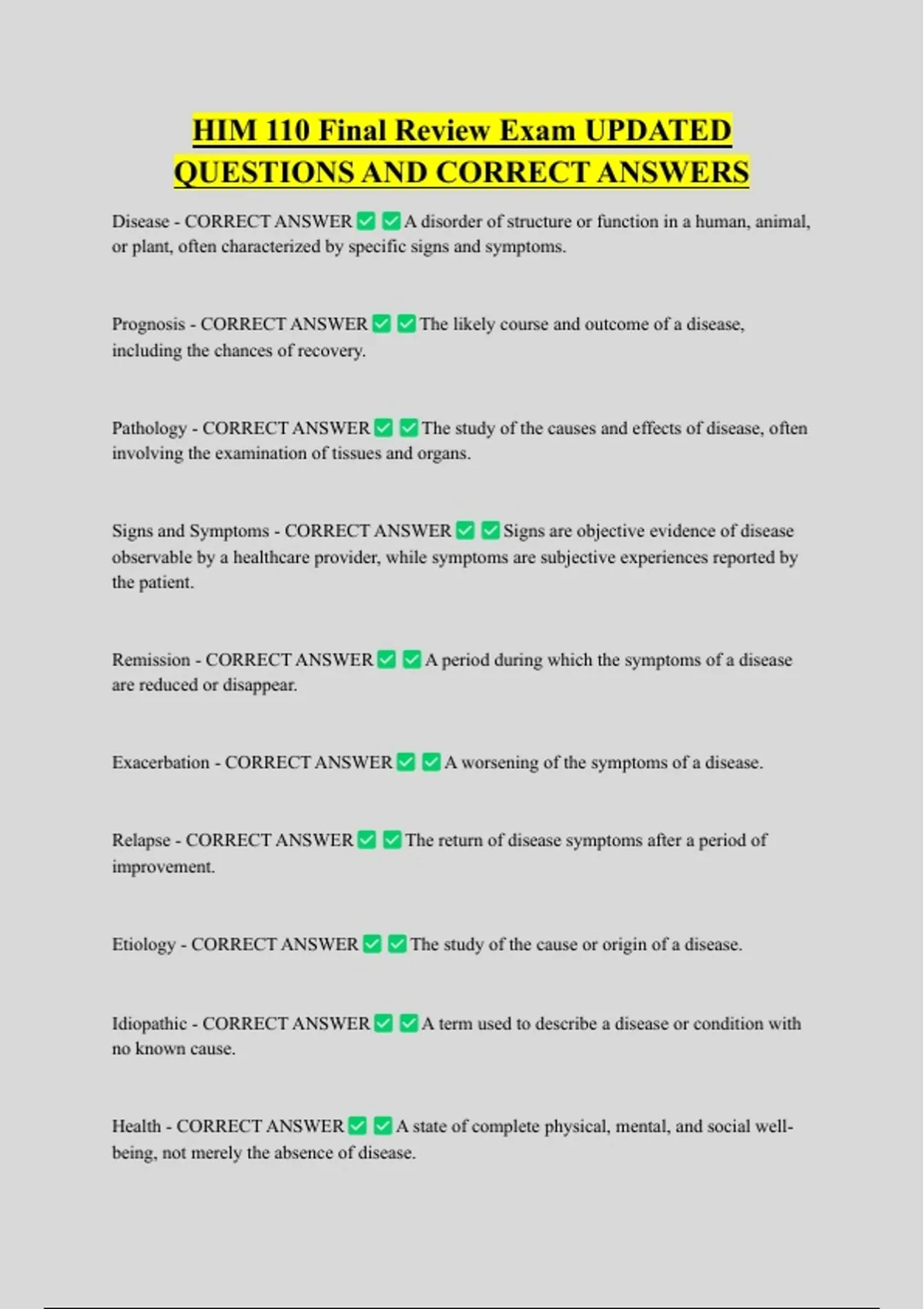HIM 110 Final Review Exam UPDATED QUESTIONS AND CORRECT ANSWERS Disease - CORRECT ANSWER A disorder of structure or function in a human, animal, or plant, often characterized by specific signs and symptoms. Prognosis - CORRECT ANSWER including the chances of recovery. Pathology - CORRECT ANSWER The likely course and outcome of a disease, The study of the causes and effects of disease, often involving the examination of tissues and organs. Signs and Symptoms - CORRECT ANSWER Signs are objective evidence of disease observable by a healthcare provider, while symptoms are subjective experiences reported by the patient. Remission - CORRECT ANSWER are reduced or disappear. Exacerbation - CORRECT ANSWER Relapse - CORRECT ANSWER improvement. Etiology - CORRECT ANSWER Idiopathic - CORRECT ANSWER no known cause. Health - CORRECT ANSWER A period during which the symptoms of a disease A worsening of the symptoms of a disease. The return of disease symptoms after a period of The study of the cause or origin of a disease. A term used to describe a disease or condition with
