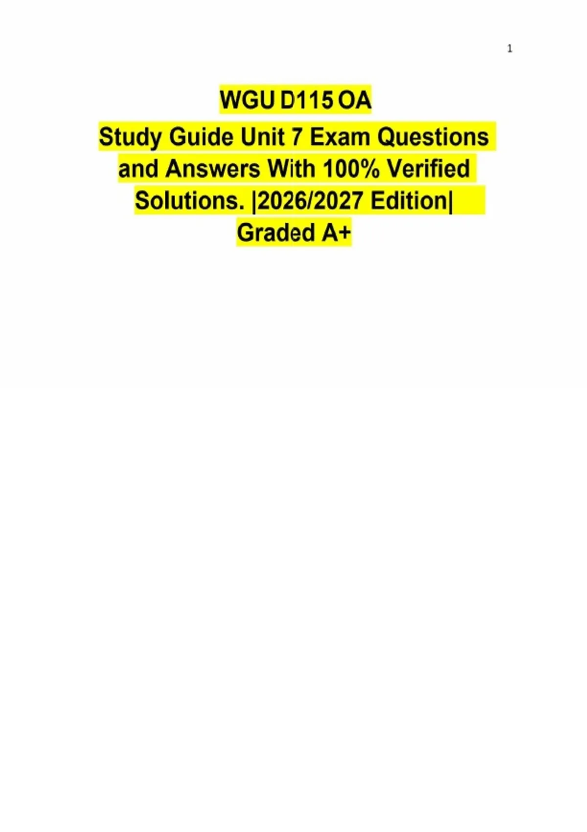 Master the clinical complexities of musculoskeletal and integumentary disorders with this 2026/2027 updated exam bank for WGU D115 Advanced Pathophysiology. This graduate-level resource features expert-verified questions and answers designed for the Unit 7 Objective Assessment. You will gain technical precision in differential diagnosis, distinguishing between Bouchard’s and Heberden’s nodes in osteoarthritis patients and understanding the stiffness patterns associated with ankylosing spondylitis. The guide provides surgical detail on pediatric forensic markers, such as corner metaphyseal fractures in infants, and masters the mechanics of osteoporosis T-score interpretation. From identifying the pathophysiology of keloid versus hypertrophic scars to managing massive burn injuries with Lactated Ringer's solution, this toolkit ensures you possess the diagnostic depth required for advanced practice nursing. These verified solutions provide the pedagogical support necessary to pass your OA with distinction.