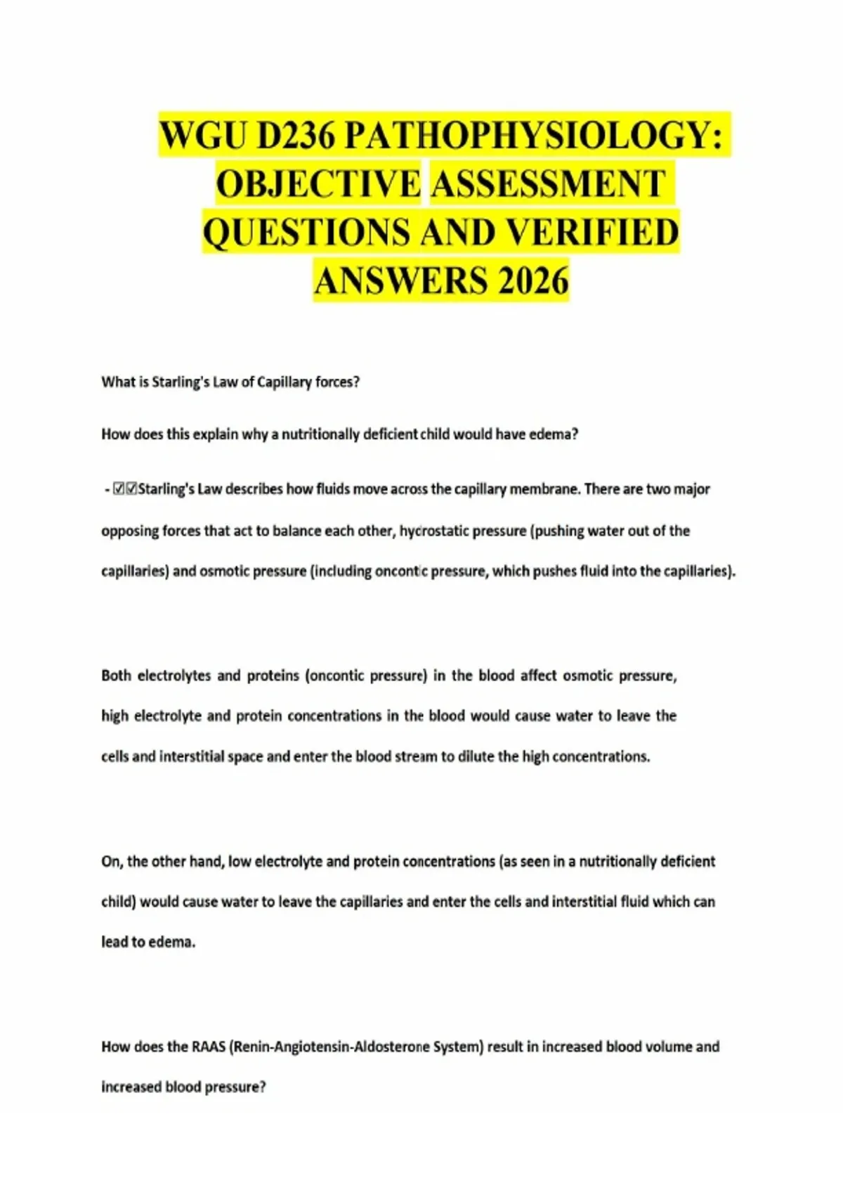 Master the critical clinical concepts of human disease with this 2026/2027 updated exam bank for WGU D236 Pathophysiology. This comprehensive resource features verified questions and answers that provide surgical detail on the physiological mechanisms tested in the Objective Assessment. You will gain technical precision in interpreting acid-base disturbances, utilizing definitive rules to distinguish between respiratory and metabolic acidosis based on pH and $PCO_2$ lab values. The guide provides a deep dive into the RAAS system’s role in blood pressure regulation and the biophysical principles of Starling's Law as it relates to edema in nutritionally deficient patients. From mastering the AEIOU criteria for dialysis to understanding the pathogenesis of Type I and Type II diabetes and the formation of advanced glycation end products (AGEs), this toolkit ensures you possess the clinical depth required for success. These verified solutions offer the pedagogical support necessary to pass your OA on the first attempt.