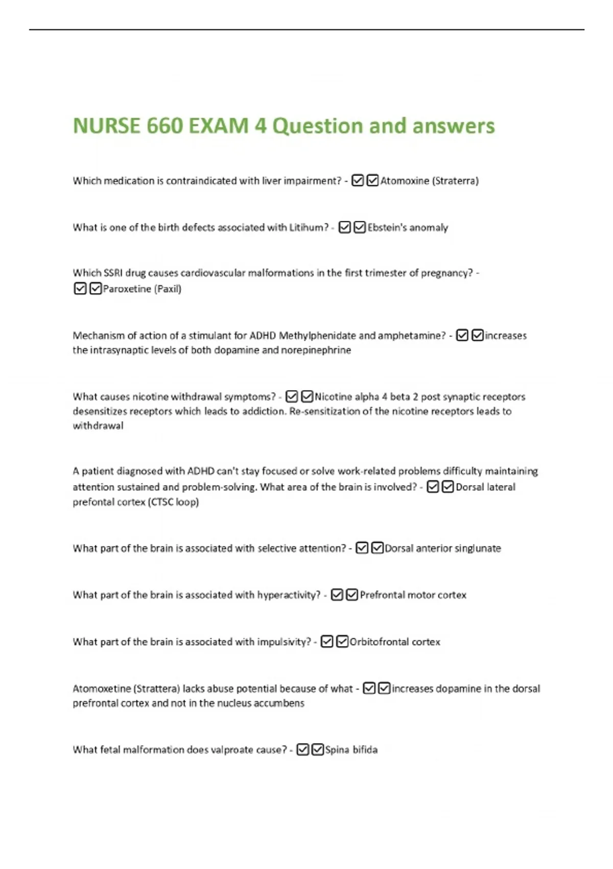 NURSE 660 EXAM 4 Question and answers Which medication is contraindicated with liver impairment? - Atomoxine (Straterra) What is one of the birth defects associated with Litihum? - Ebstein's anomaly Which SSRI drug causes cardiovascular malformations in the first trimester of pregnancy? - Paroxetine (Paxil) Mechanism of action of a stimulant for ADHD Methylphenidate and amphetamine? - increases the intrasynaptic levels of both dopamine and norepinephrine