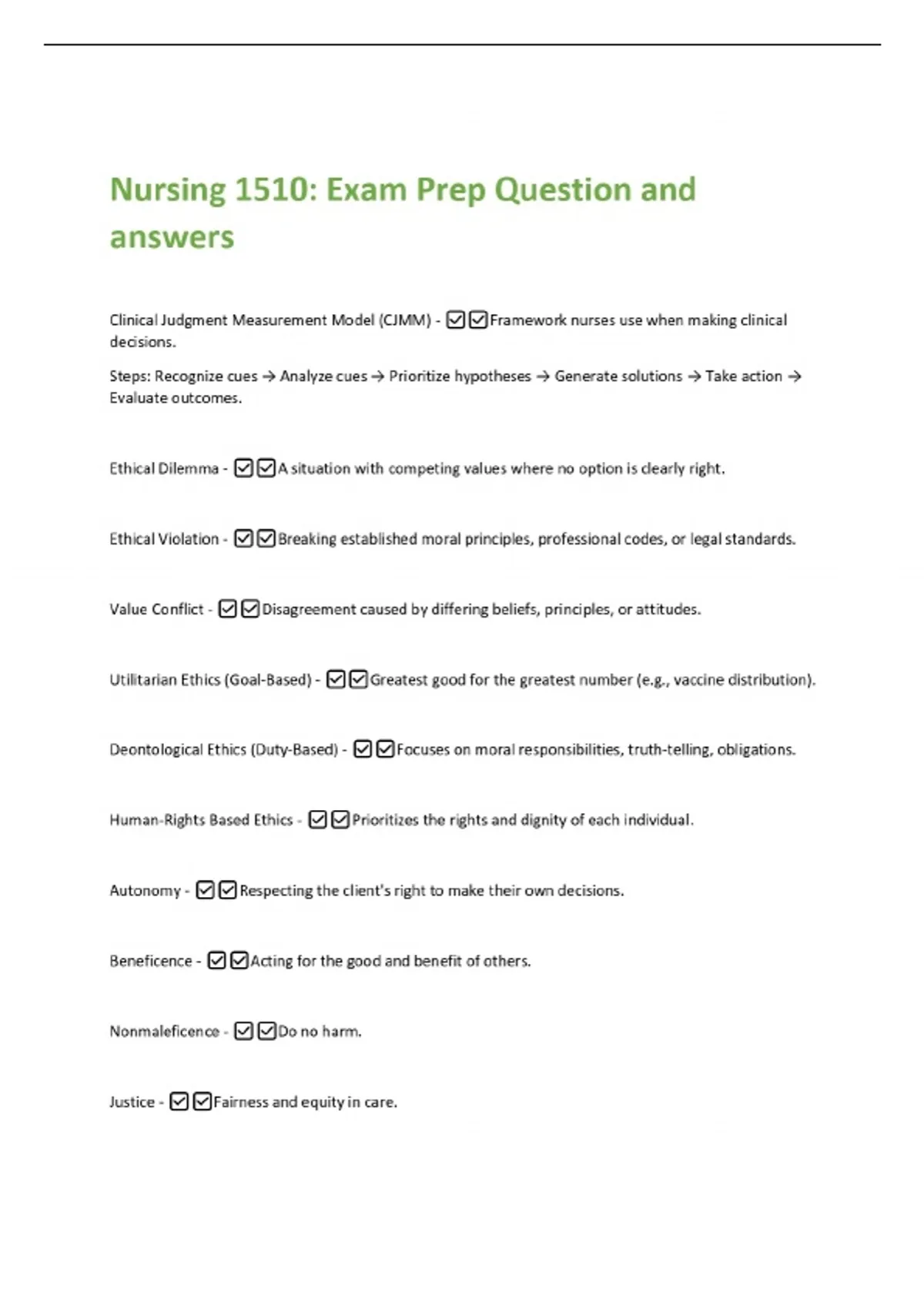 Nursing 1510: Exam Prep Question and answers Clinical Judgment Measurement Model (CJMM) - Framework nurses use when making clinical decisions. Steps: Recognize cues → Analyze cues → Prioritize hypotheses → Generate solutions → Take action → Evaluate outcomes. Ethical Dilemma - A situation with competing values where no option is clearly right. Ethical Violation - Breaking established moral principles, professional codes, or legal standards. Value Conflict - Disagreement caused by differing beliefs, principles, or attitudes.
