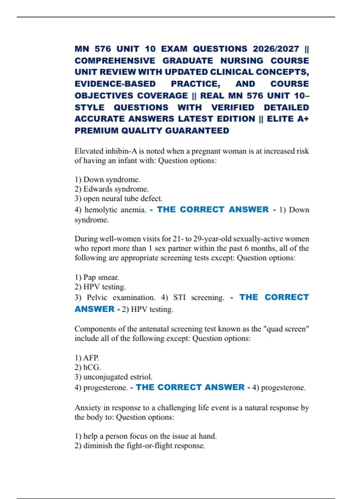 MN 576 UNIT 10 EXAM QUESTIONS 2026/2027 || COMPREHENSIVE GRADUATE NURSING COURSE UNIT REVIEW WITH UPDATED CLINICAL CONCEPTS, EVIDENCE-BASED PRACTICE, AND COURSE OBJECTIVES COVERAGE || REAL MN 576 UNIT 10–STYLE QUESTIONS WITH VERIFIED DETAILED ACCURATE ANSWERS LATEST EDITION || ELITE A+ PREMIUM QUALITY GUARANTEED Elevated inhibin-A is noted when a pregnant woman is at increased risk of having an infant with: Question options: 1) Down syndrome. 2) Edwards syndrome. 3) open neural tube defect. 4) hemolytic anemia. - THE CORRECT ANSWER - 1) Down syndrome. During well-women visits for 21- to 29-year-old sexually-active women who report more than 1 sex partner within the past 6 months, all of the following are appropriate screening tests except: Question options: 1) Pap smear. 2) HPV testing. 3) Pelvic examination. 4) STI screening. - THE CORRECT ANSWER - 2) HPV testing.