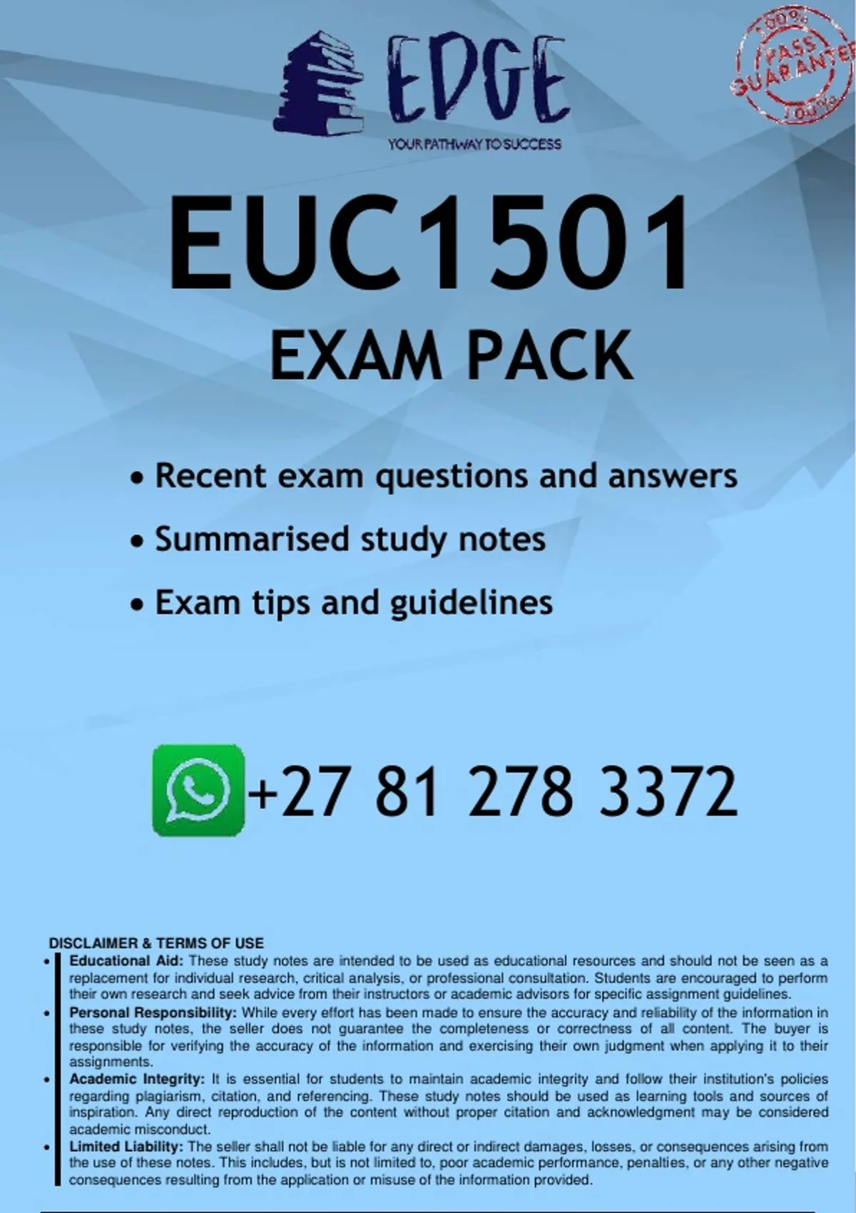 Well-structured EUC1501 EXAM PREPARATION PACK - DISTINCTION GUARANTEED. Contains recent exam questions and answers, and Summarised study notes. All you need to pass the 2026 EXAMS
