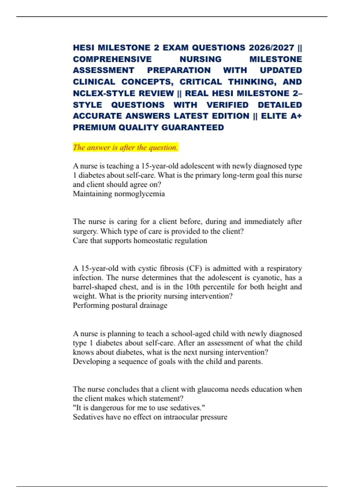 HESI MILESTONE 2 EXAM QUESTIONS 2026/2027 || COMPREHENSIVE NURSING MILESTONE ASSESSMENT PREPARATION WITH UPDATED CLINICAL CONCEPTS, CRITICAL THINKING, AND NCLEX-STYLE REVIEW || REAL HESI MILESTONE 2–STYLE QUESTIONS WITH VERIFIED DETAILED ACCURATE ANSWERS LATEST EDITION || ELITE A+ PREMIUM QUALITY GUARANTEED The answer is after the question. A nurse is teaching a 15-year-old adolescent with newly diagnosed type 1 diabetes about self-care. What is the primary long-term goal this nurse and client should agree on? Maintaining normoglycemia The nurse is caring for a client before, during and immediately after surgery. Which type of care is provided to the client? Care that supports homeostatic regulation A 15-year-old with cystic fibrosis (CF) is admitted with a respiratory infection. The nurse determines that the adolescent is cyanotic, has a barrel-shaped chest, and is in the 10th percentile for both height and weight. What is the priority nursing intervention? Performing postural drainage